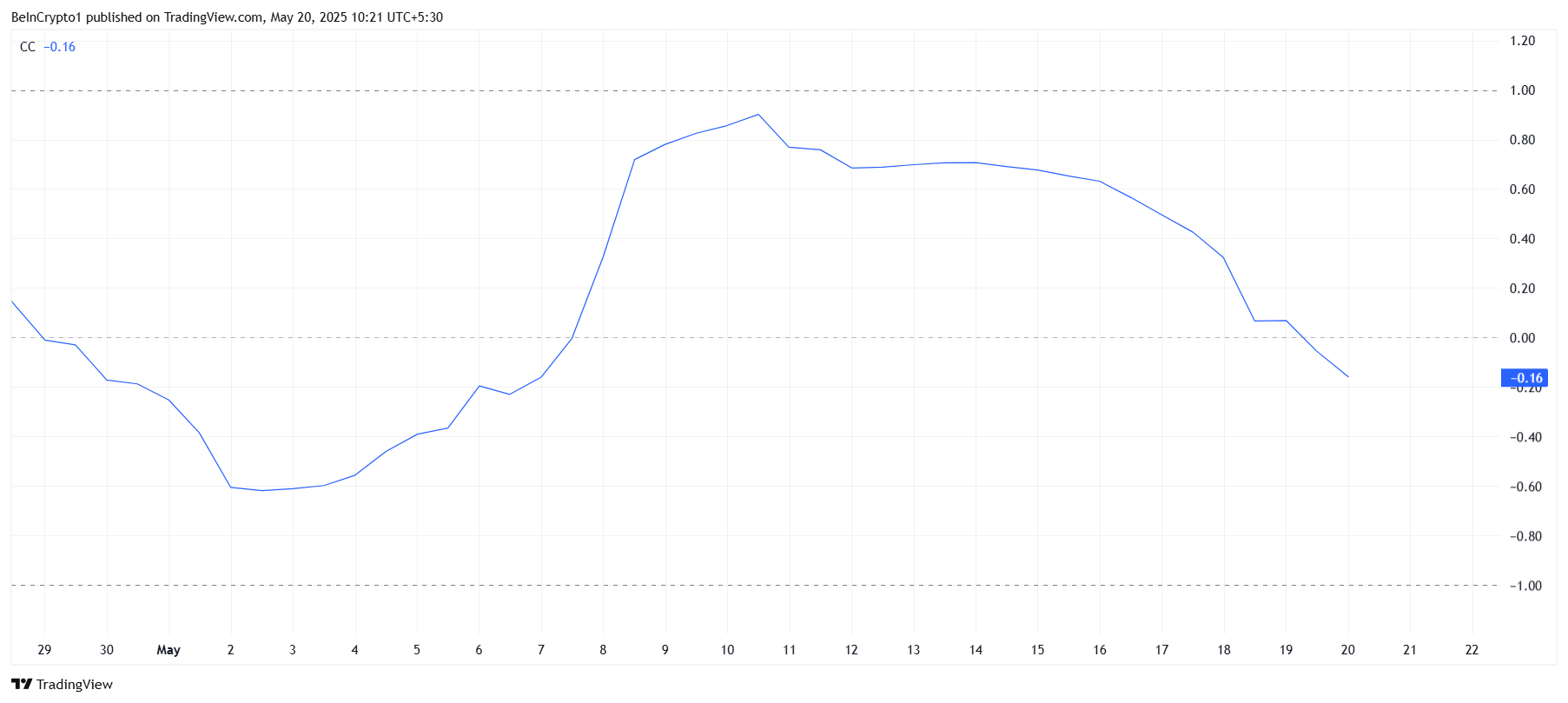 Бұрын күш көзі болған Pi Network пен Bitcoin арасындағы байланыс айтарлықтай әлсіреді. Корреляция -0,16-ға дейін төмендеп, Pi Bitcoin-нен ажырағанын көрсетеді. Бұл әсіресе алаңдатарлық, себебі Bitcoin бағасы 106 000 долларға жуықтап, жаңа тарихи максимумға жету ықтималдығы бар.