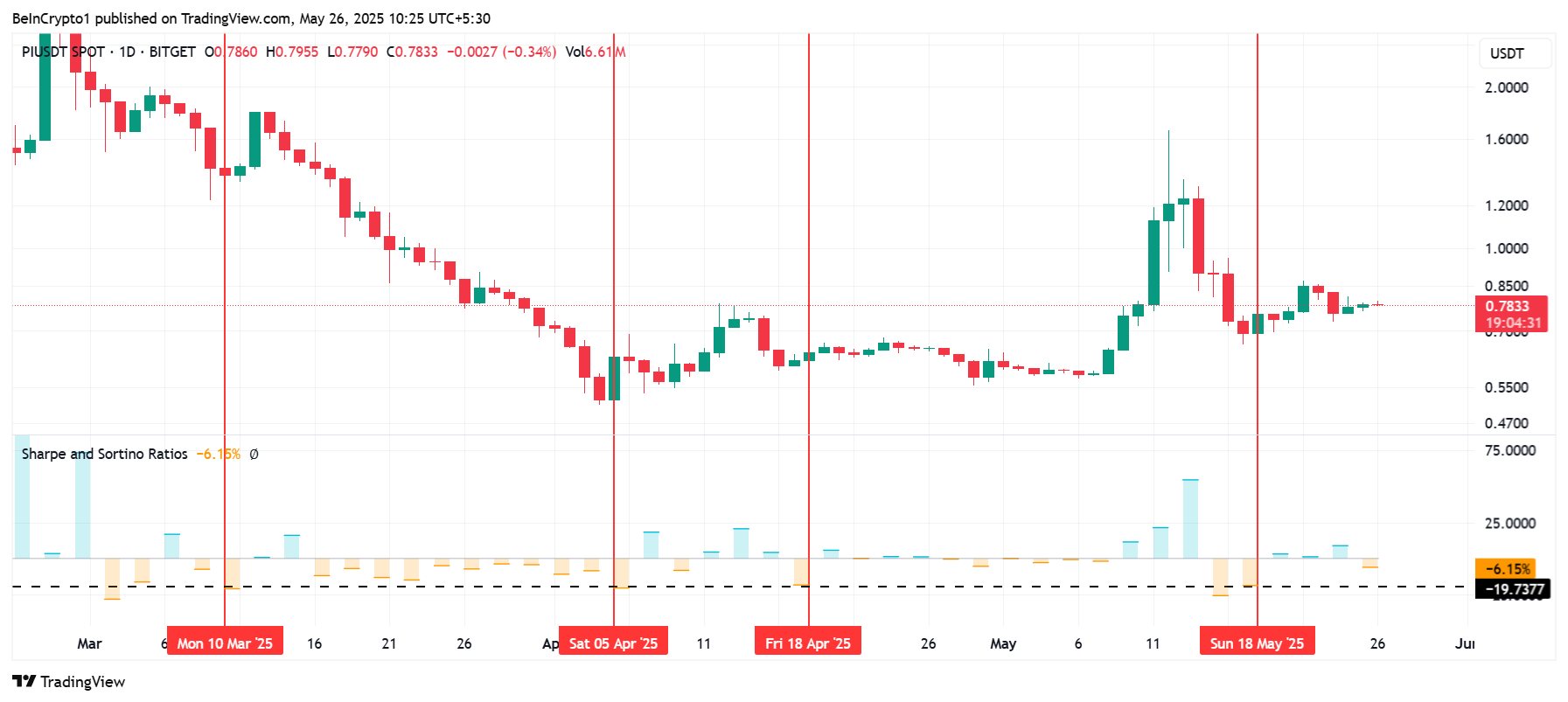 Тәуекелге бейімделген кірісті өлшейтін Шарп коэффициенті Pi Network-тің ағымдағы аю импульсінің күшейіп жатқанын көрсетеді. Алайда, коэффициент әлі толық нарықтық кері бұрылуды тудыратындай күшті деңгейде емес. Тарихи тұрғыдан алғанда, Шарп коэффициенті -19%-ға жеткенде, бұл уақытша төменгі нүктені білдіріп, көбінесе бағаның көтерілуімен жалғасатын.