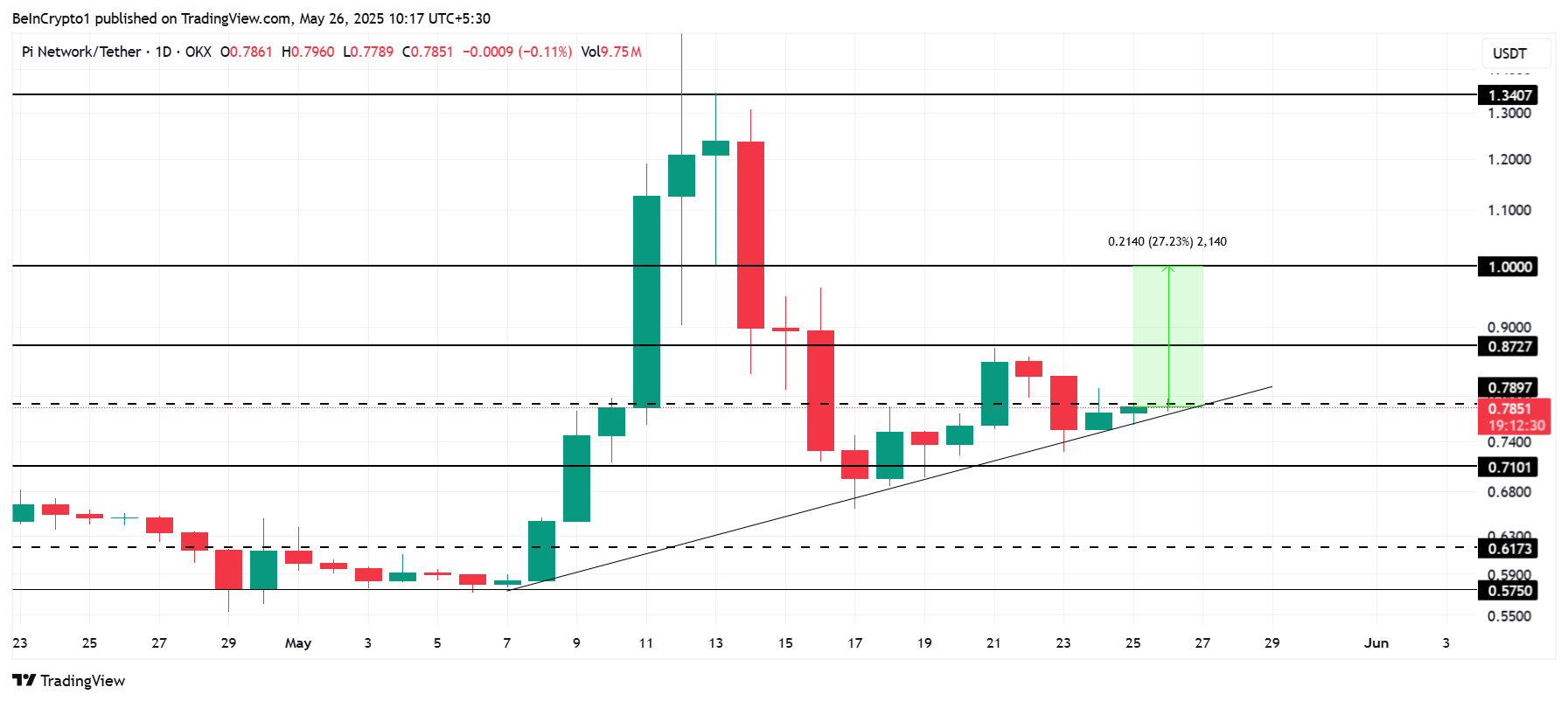 0,78 долларда Pi Network 1,00 доллар психологиялық кедергіден 27%-ға алыс. Бұл деңгей инвесторлар үшін өте маңызды, өйткені 1,00 долларды бұзып, оны қолдауға айналдыру жаңа инвестициялар толқынын әкелуі мүмкін. Алайда, ағымдағы бағаның тоқырауы бұл бұқа серпілісінің болатынына күмән тудырады.