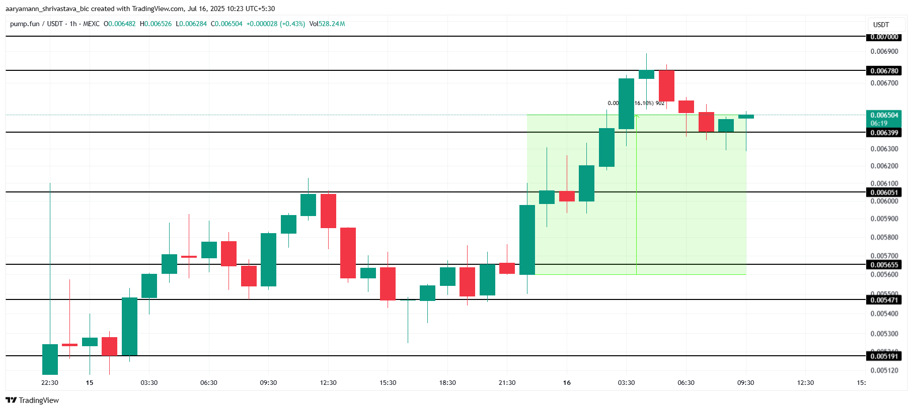 PUMP бағасы 0,0063 доллар қолдау деңгейінен серпіліп, 0,0065 доллар деңгейінде тұр. Токен соңғы 12 сағатта 16%-ға өсті, бұл PUMP-қа сұраныстың күшті екенін көрсетеді. Қазіргі импульс пен инвесторлардың сенімін ескере отырып, токен жақын арада жоғары қарай итермелеуді жалғастыруы ықтимал.