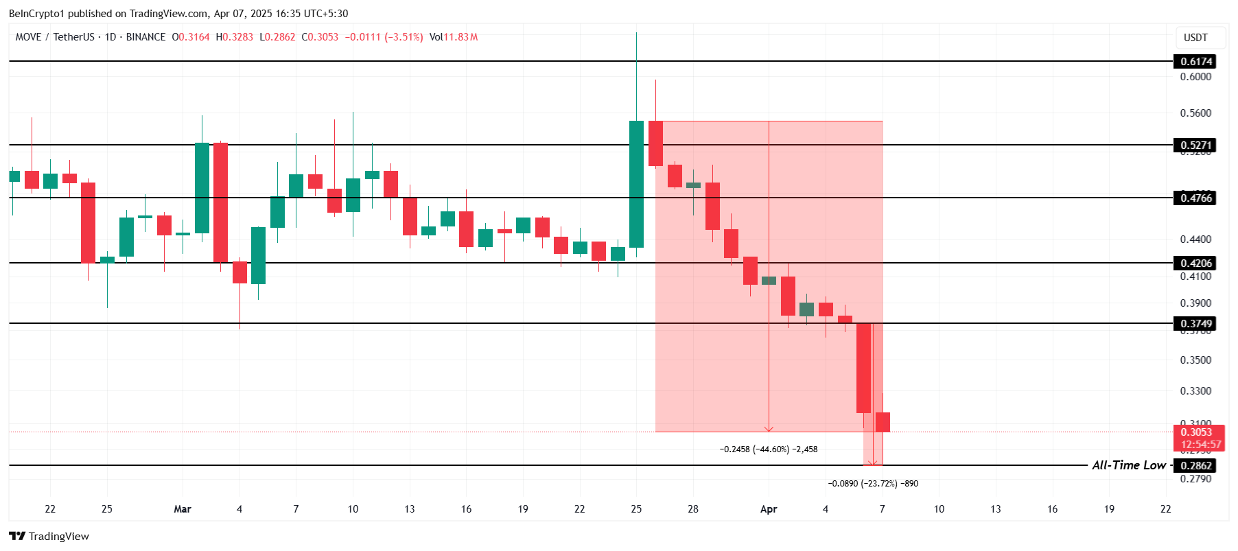 MOVE бағасы соңғы екі аптада 44%-ға айтарлықтай түзетуден өтті, қазіргі уақытта 0,305 доллар деңгейінде саудалануда. Бұл төмендеу соңғы 24 сағатта айтарлықтай болды, себебі MOVE жаңа тарихи минимум (ATL) 0,286 доллар деңгейінде қалыптасты, 23%-ға төмендеді. Бұл құлдырау инвесторларды бағаның одан әрі төмендеуі туралы алаңдатып отыр.