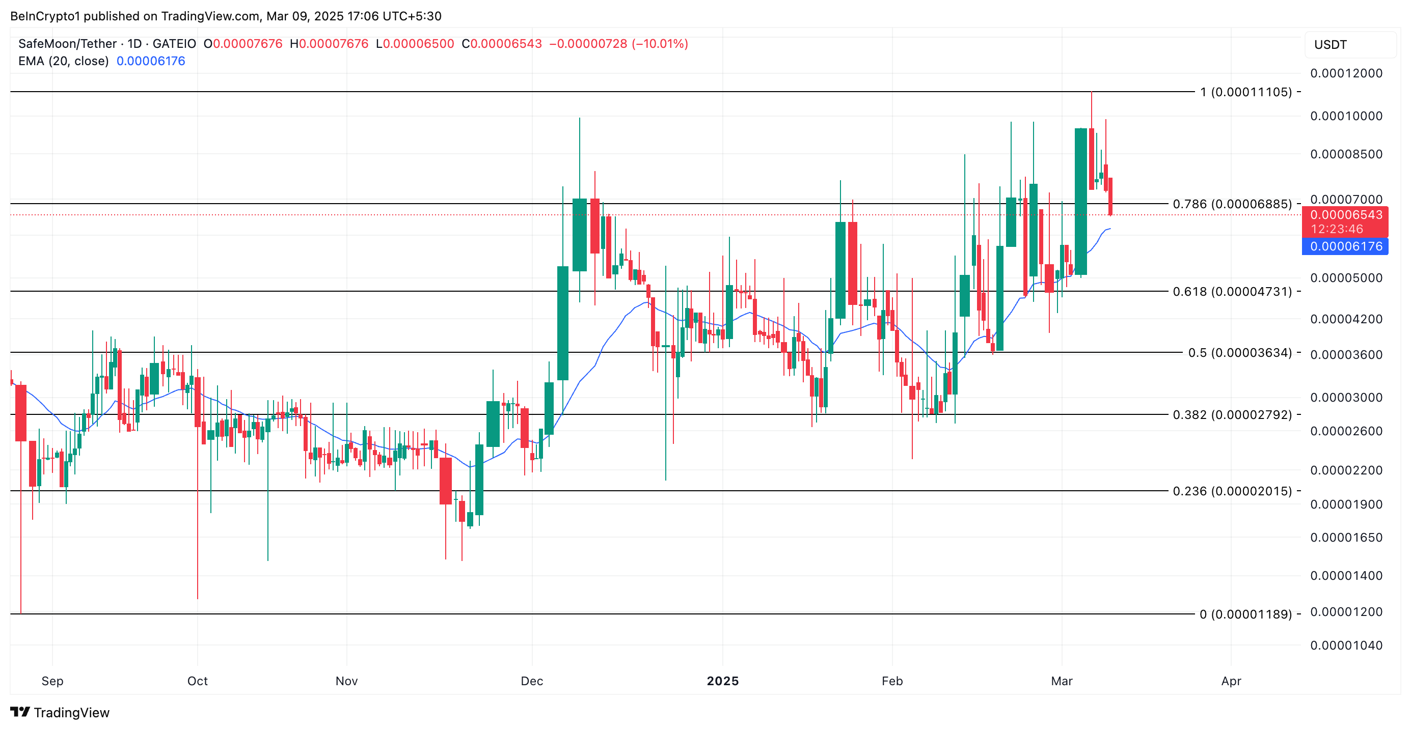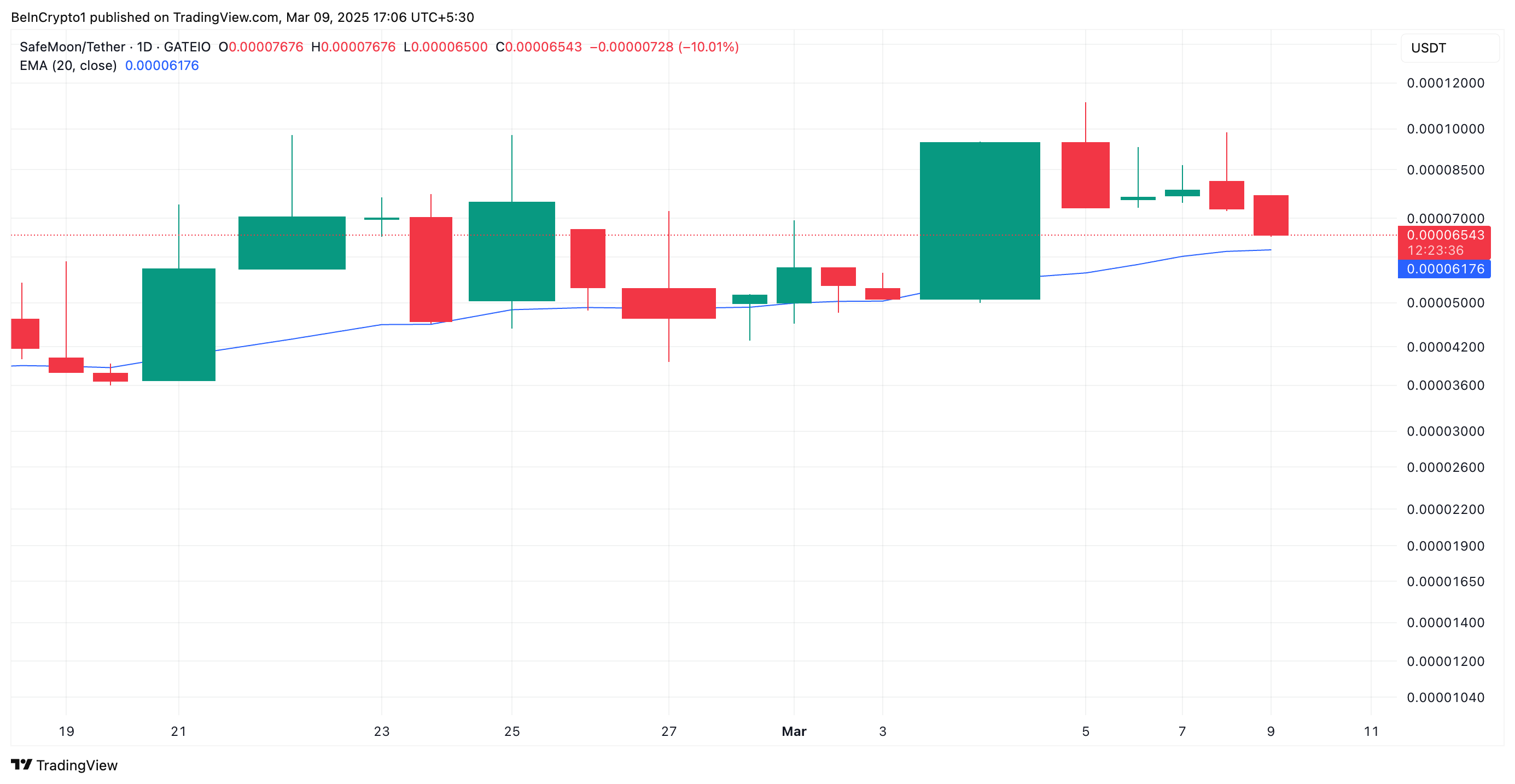 SafeMoon-ның 20 күндік EMA-мен қамтамасыз етілген динамикалық қолдауды сәтті бұзу аю трендін күшейтеді. Бұл сценарийде альткоиннің бағасы одан әрі төмендеуі мүмкін 0,000047 долларға дейін.