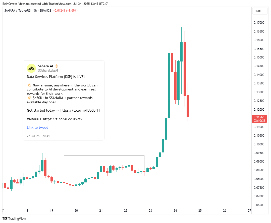 Алайда, токен өзінің шыңын ұзақ ұстай алмады. 24 шілде күні SAHARA өзінің ең жоғары деңгейінен 30%-дан астам төмендеді. Бұл күрт құлдырау ерте сатып алушылардың жылдам пайда табуын көрсетті.