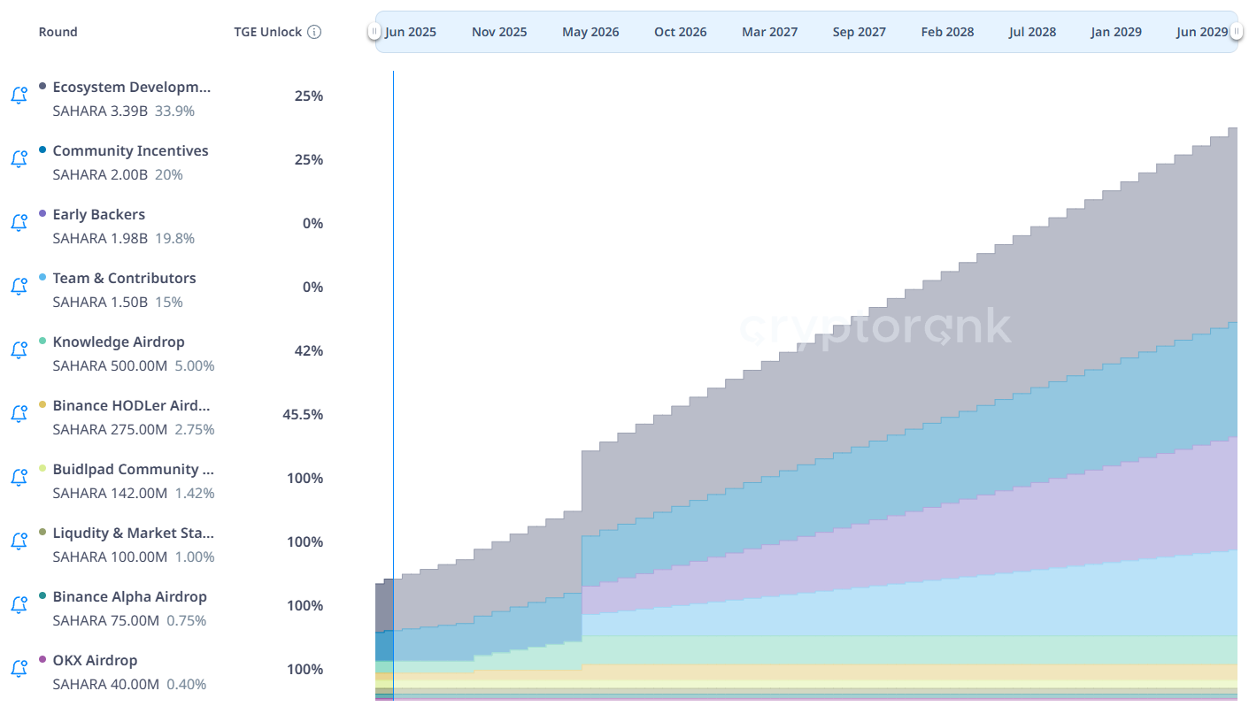 Сонымен қатар, SAHARA-ның токеномикасы әлі ерте кезеңінде. Жобаның жалпы ұсынысы 10 млрд токенді құрайды, бірақ тек 2,04 млрд (20,4%) қазіргі уақытта айналымда. Қалған 78% құлыптаулы және 2029 жылға дейін біртіндеп ашылады.