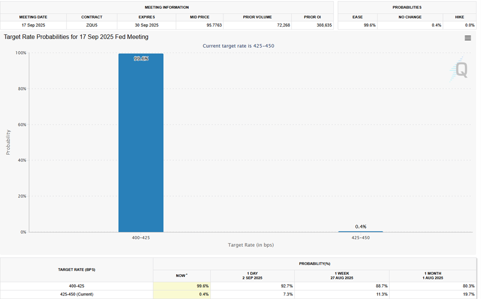 CME FedWatch Tool мәліметтері бойынша, нарықтар ФРЖ қыркүйек айындағы отырысында мөлшерлемелерді төмендетеді деген 99,6% ықтималдықты бағалап отыр.