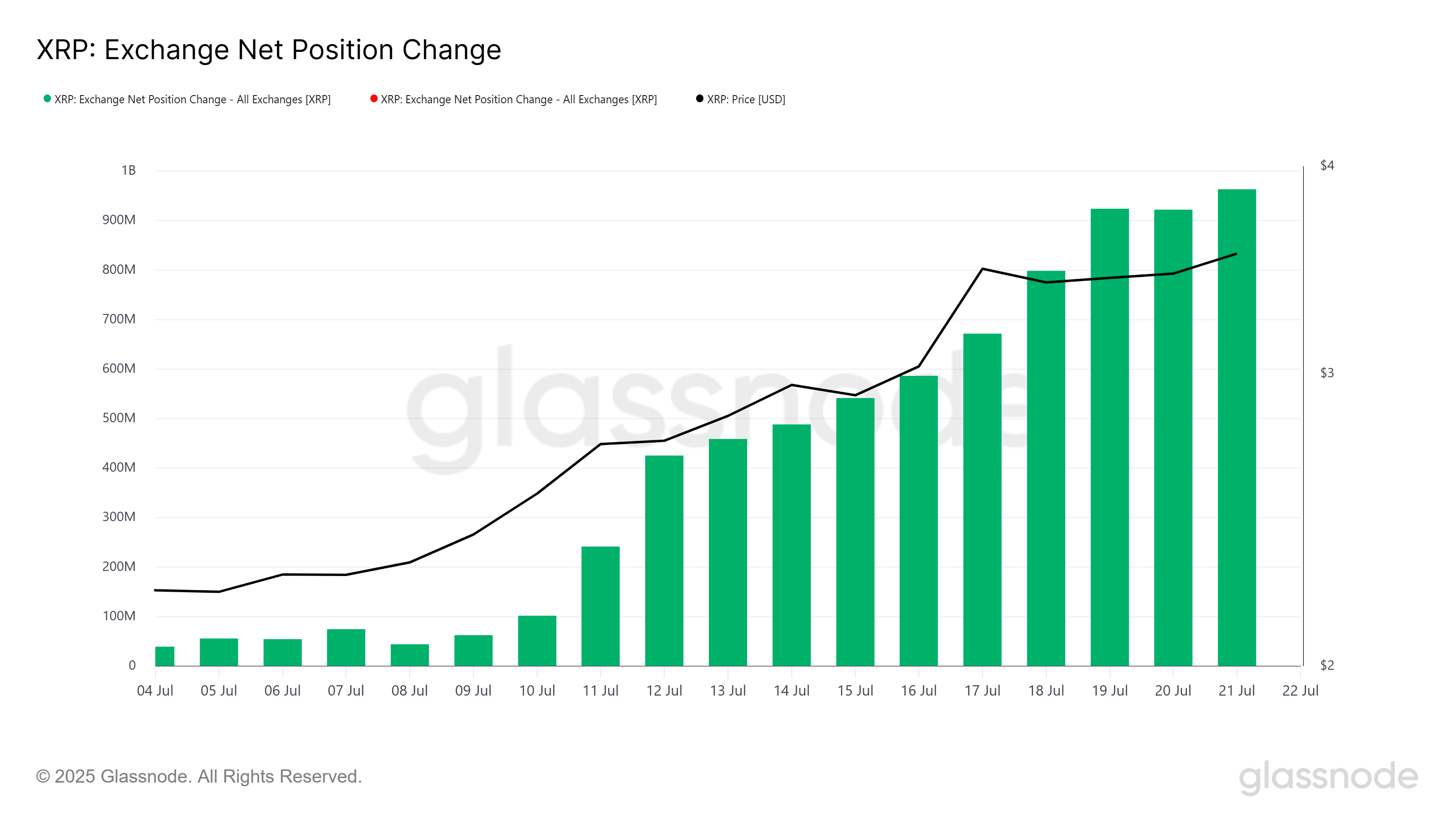 Инвесторлар үлкен көлемде XRP сата бастады, бұл одан әрі өсуге деген сенімнің төмендеуін көрсетеді. Өткен аптада биржа әмияндарына 450 млн-нан астам XRP кірісі байқалды, бұл 2,81 млрд доллардан астамға бағаланды. Бұл ұсыныстың күрт өсуі иелерінің активтерін сатуға ауыстырып жатқанын көрсетеді, бұл әдетте нарық циклдарында аю индикаторы болып табылады.