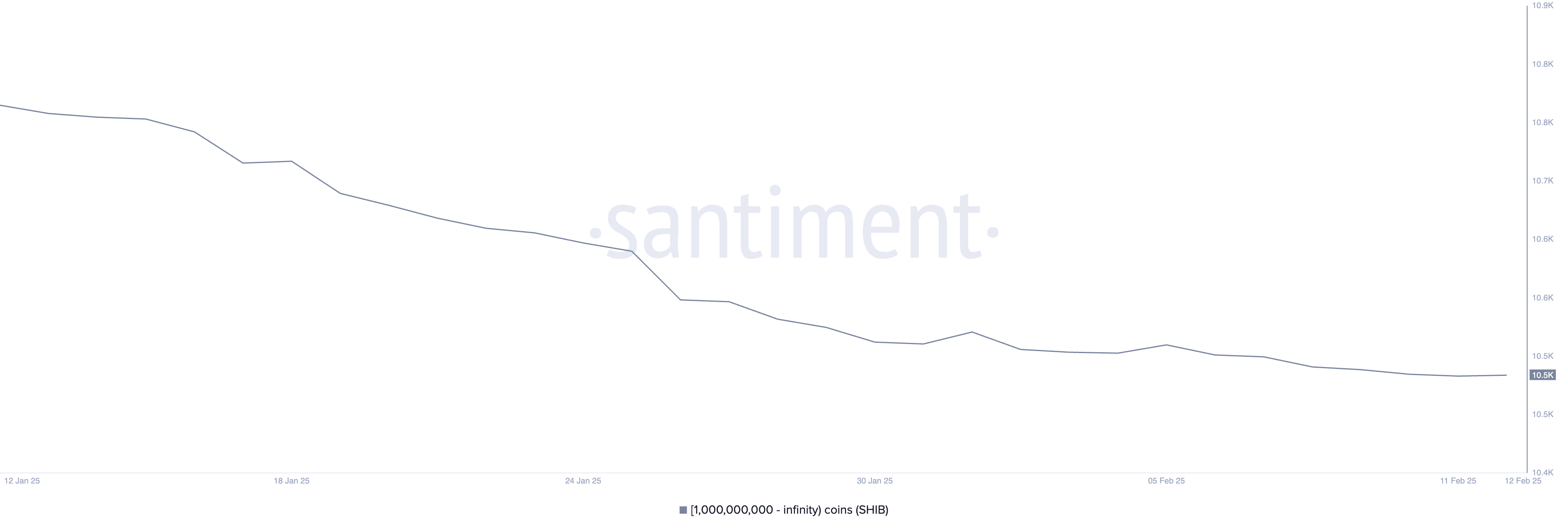 SHIB киттерінің саны – кем дегенде 1 000 000 000 SHIB ұстайтын мекенжайлар – 10 546-ға дейін төмендеді, бұл 2022 жылдың шілдесінен бергі ең төменгі деңгей. Бұл төмендеу ірі ұстаушылардың өз позицияларын азайтып жатқанын көрсетеді, бұл ірі инвесторлар арасындағы сенімнің әлсіреуін білдіруі мүмкін.