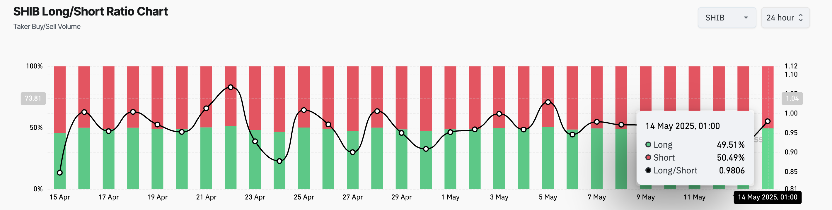 Сонымен қатар, 6 мамырдан бастап SHIB бойынша қысқа позицияларға сұраныстың айтарлықтай өсуі байқалды. Coinglass мәліметтері бойынша, монетаның Ұзақ/Қысқа қатынасы сол уақыттан бері бірден төмен мәндерге оралды, бұл қысқа ставкаларға деген өсіп келе жатқан артықшылықты көрсетеді. Жазу кезінде, қатынас 0,98-ге тең.