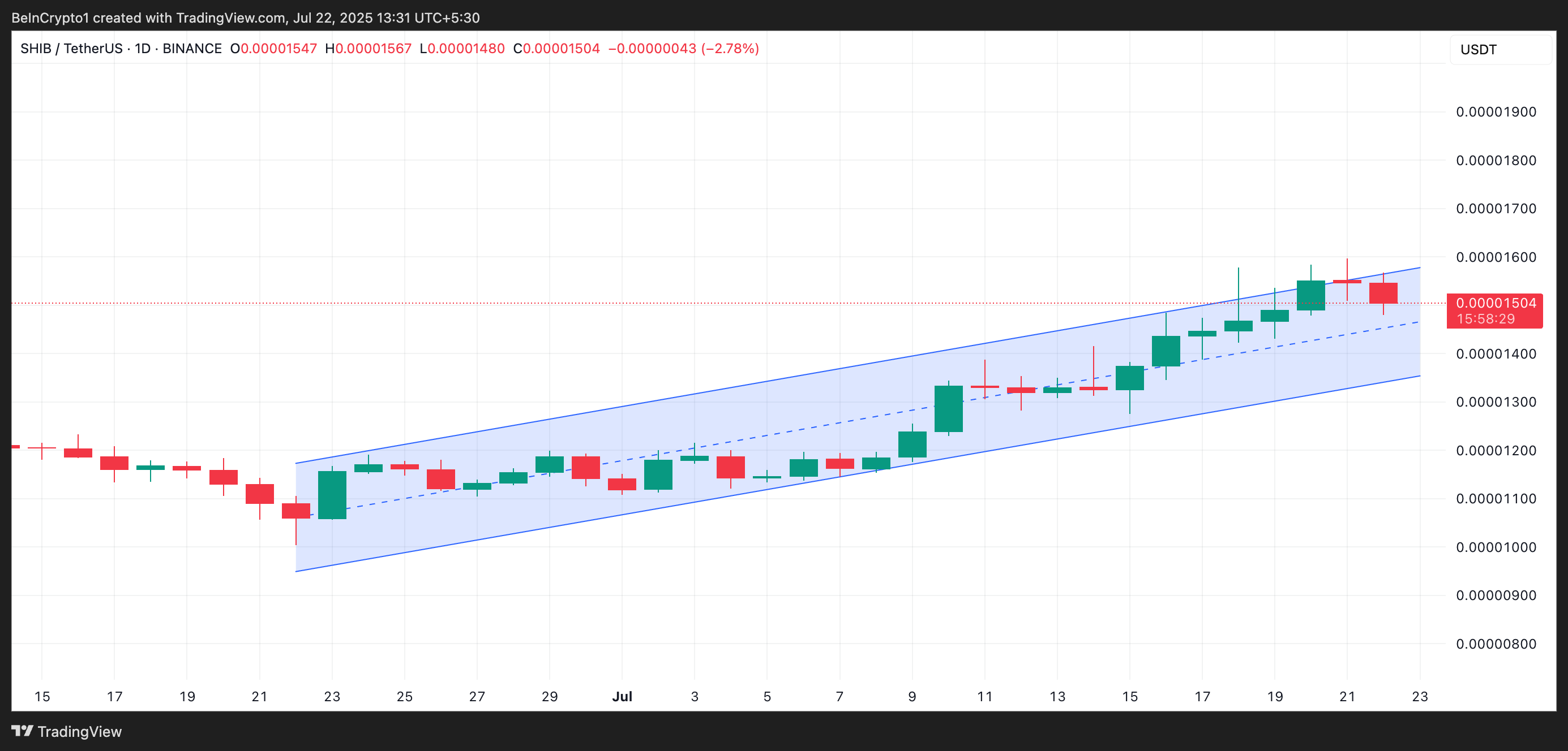 SHIB/USD бір күндік графигі мемкоиннің 22 маусымнан бастап көтерілу параллель арнасында қозғалып жатқанын көрсетеді. Арна активтің бағасы екі жоғары бағытталған сызық арасында қозғалғанда пайда болады, бұл жоғары шыңдар мен төменгі шыңдардың тұрақты үлгісін көрсетеді.