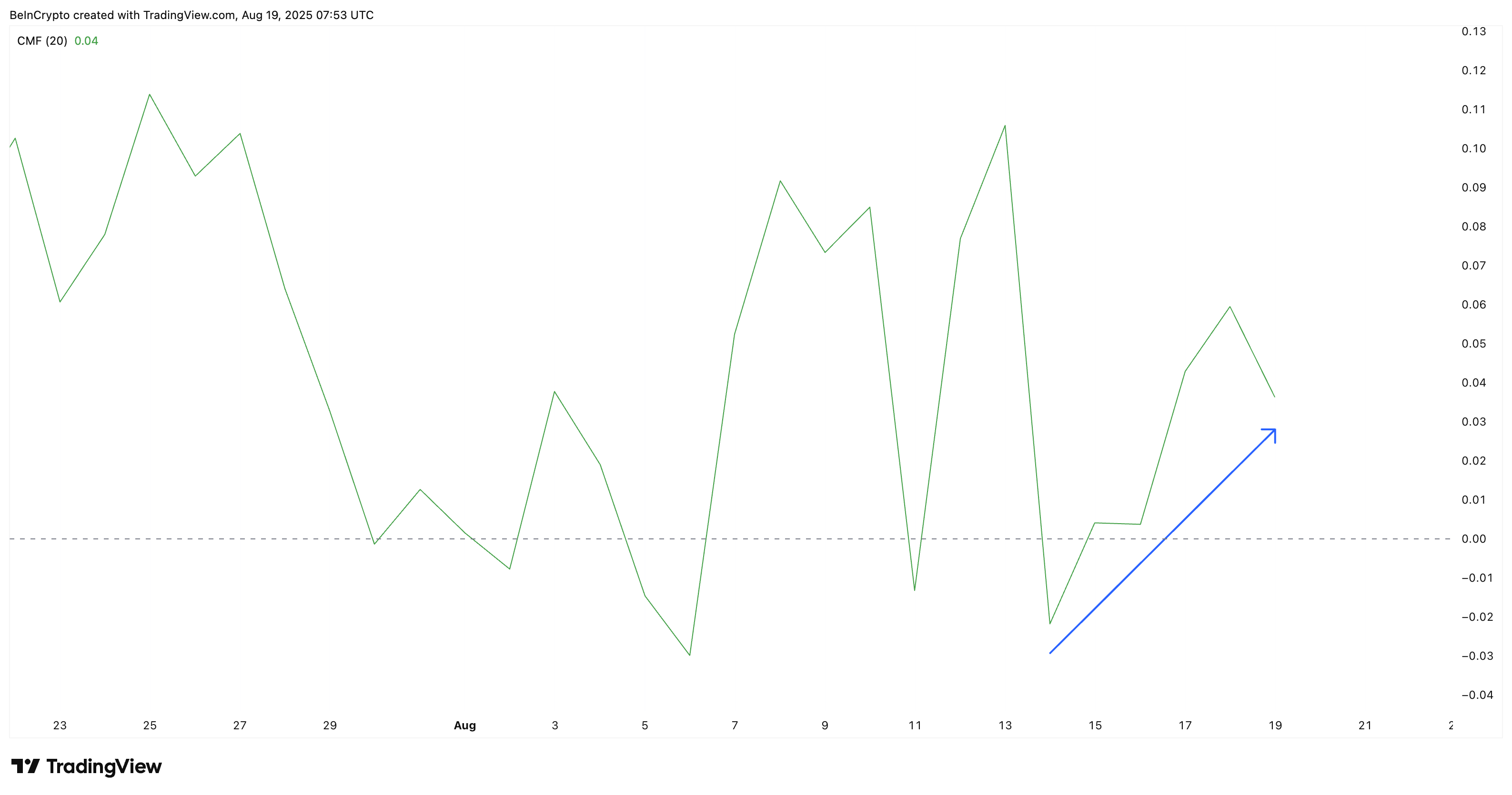 CMF баға мен көлемді біріктіріп, сатып алу немесе сату қысымын көрсетеді; нөлден жоғары мәндер жинақтауды, ал нөлден төмен мәндер таралуды білдіреді.