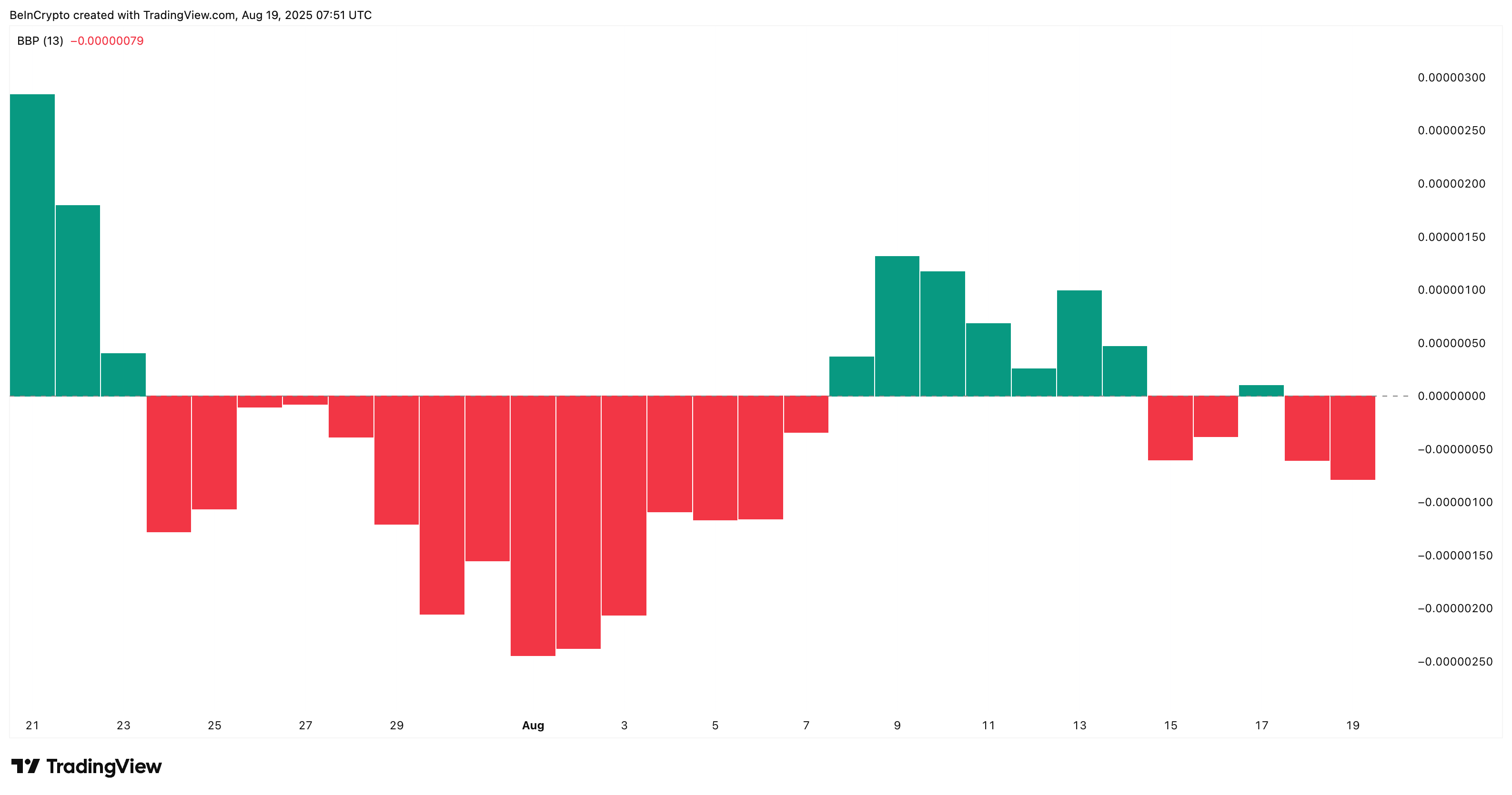 Қағазда аз болса да, бұл белсенділіктің төмендеуі аюлық әрекетке сәйкес келеді. Bull-Bear Power (BBP) индикаторы сатылым қысымының артып келе жатқанын көрсетеді, бұл аюлардың Shiba Inu бағасының импульсін біртіндеп бақылауға алып жатқанын білдіреді.