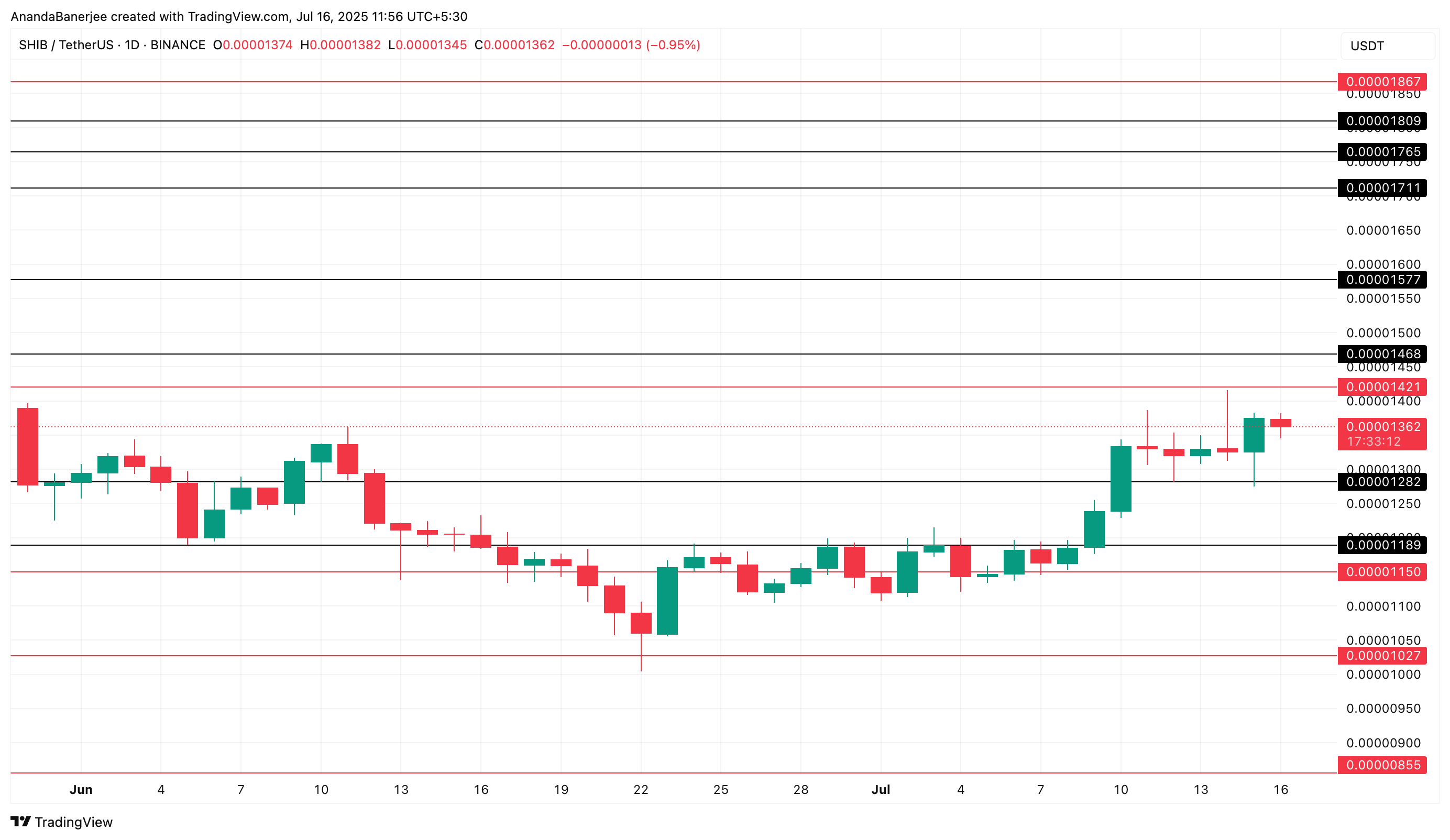Shiba Inu (SHIB) бағасы қазіргі уақытта 0,00001421 доллар маңындағы кішігірім қарсылық деңгейіне қарсы тұр, ол бұрын қол жеткізе алмаған. Одан әрі, графикте негізгі ұсыныс аймақтары 0,00001468, 0,00001577 және 0,00001765 долларда көрсетілген.
