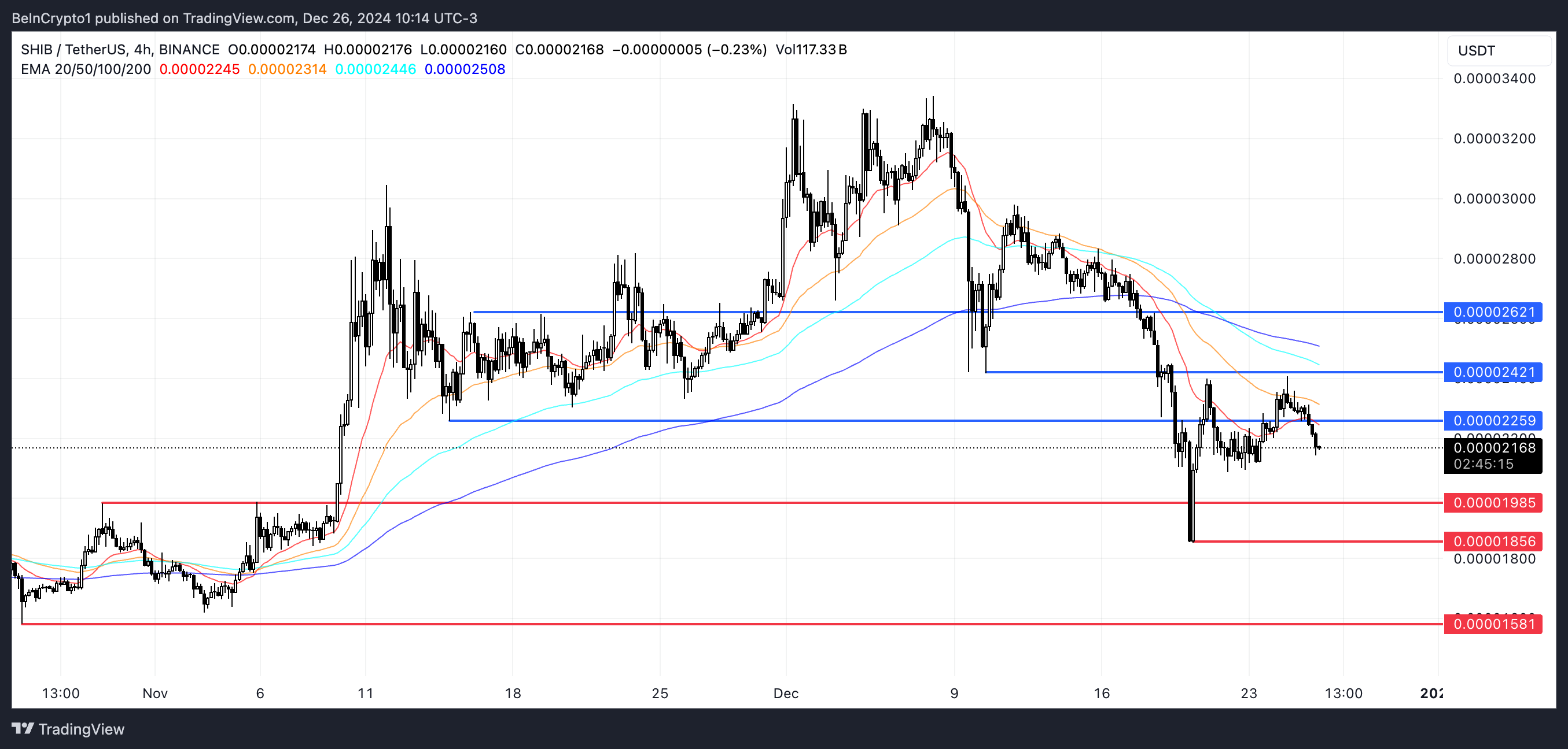 Егер SHIB ағымдағы төмендеу тренді жалғасса, баға жақын арада $0.0000198 қолдау деңгейін сынауы мүмкін.