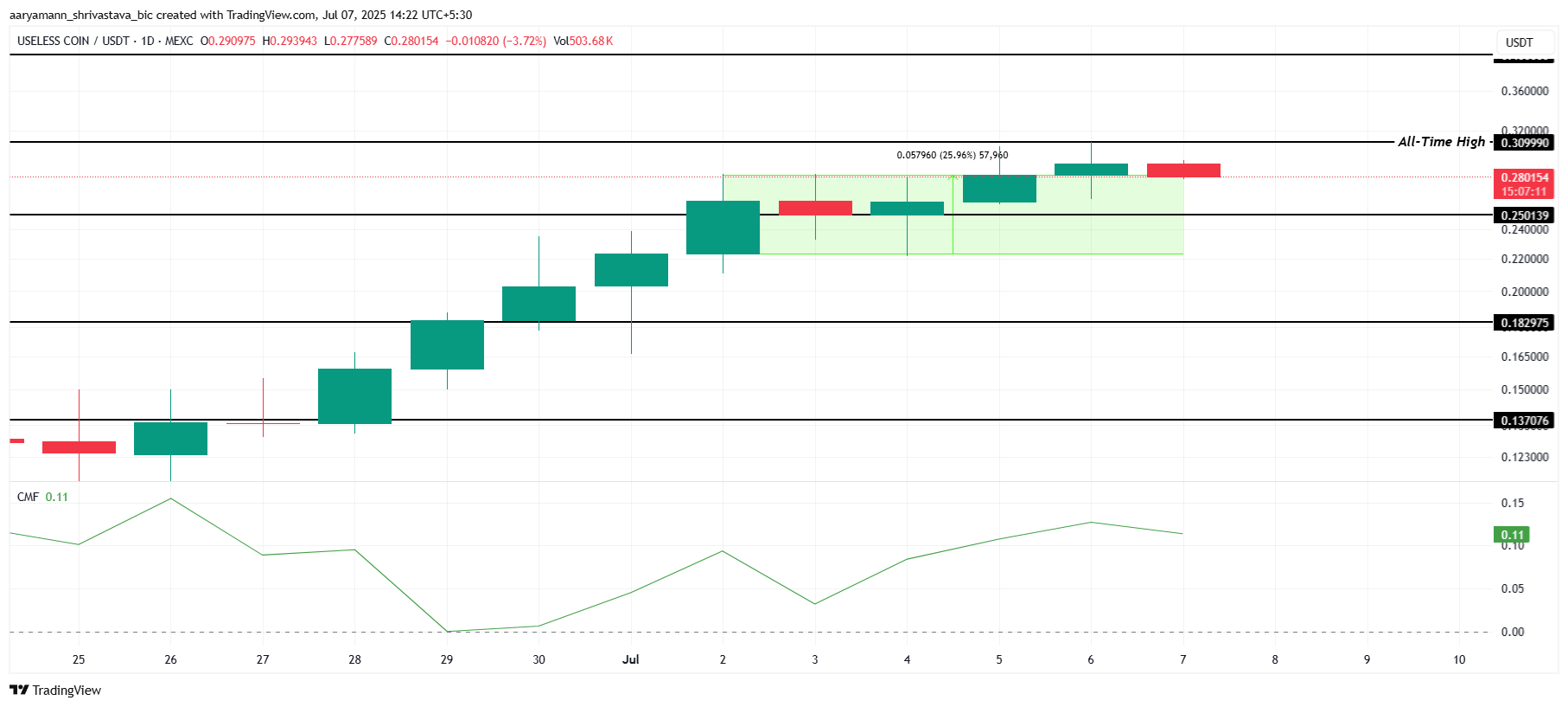 0,250 долларды қолдау деңгейі ретінде бекітіп, USELESS өсуге дайын көрінеді. Chaikin Money Flow (CMF) күшті кірістерді көрсетіп, альткоиннің жоғарылау трендін қолдайды. Егер бұл жалғаса берсе, USELESS өзінің тарихи максимумын (ATH) 0,309 доллардан асып, жаңа ATH 0,400 долларда орнатуы мүмкін.