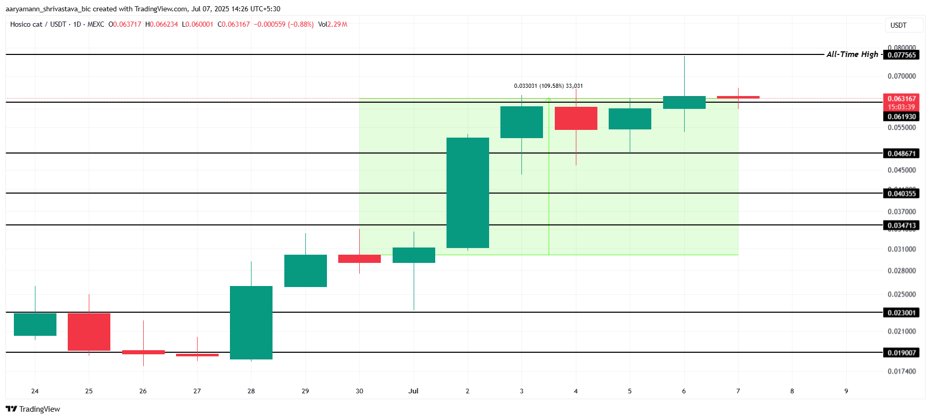 Бұл өсу кезінде HOSICO жаңа тарихи максимумды (ATH) 0,0775 долларда орнатты. Альткоиннің бұқа тренді жалғасуы ықтимал, жаңа ATH қалыптастыру мүмкіндігімен. Егер импульс сақталса, HOSICO одан да үлкен баға қозғалыстарын көріп, инвесторлардың назарын аудара алады.