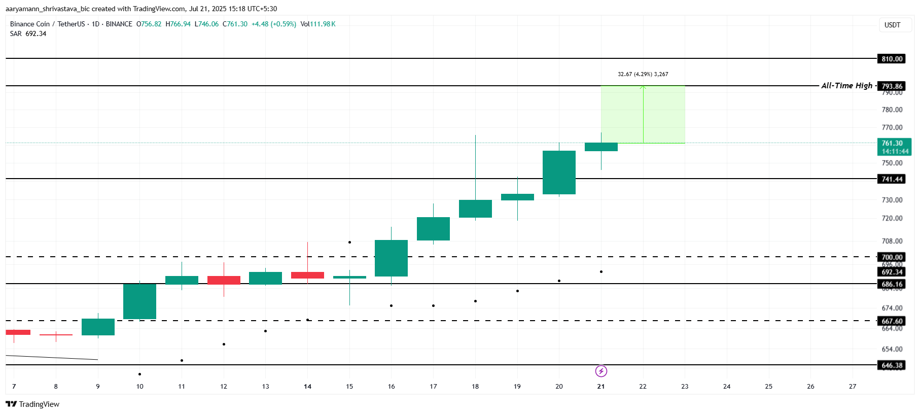 BNB бағасы қазіргі уақытта 761 доллар деңгейінде саудаланып, өзінің 793 доллар тарихи максимумын бұзуға небәрі 4%-ға жетпей тұр. Инвесторлар бұл сәтті жеті ай бойы күтті. Серпіліске қол жеткізу үшін альткоин алдымен 741 долларды тұрақты қолдау ретінде қамтамасыз етуі керек.