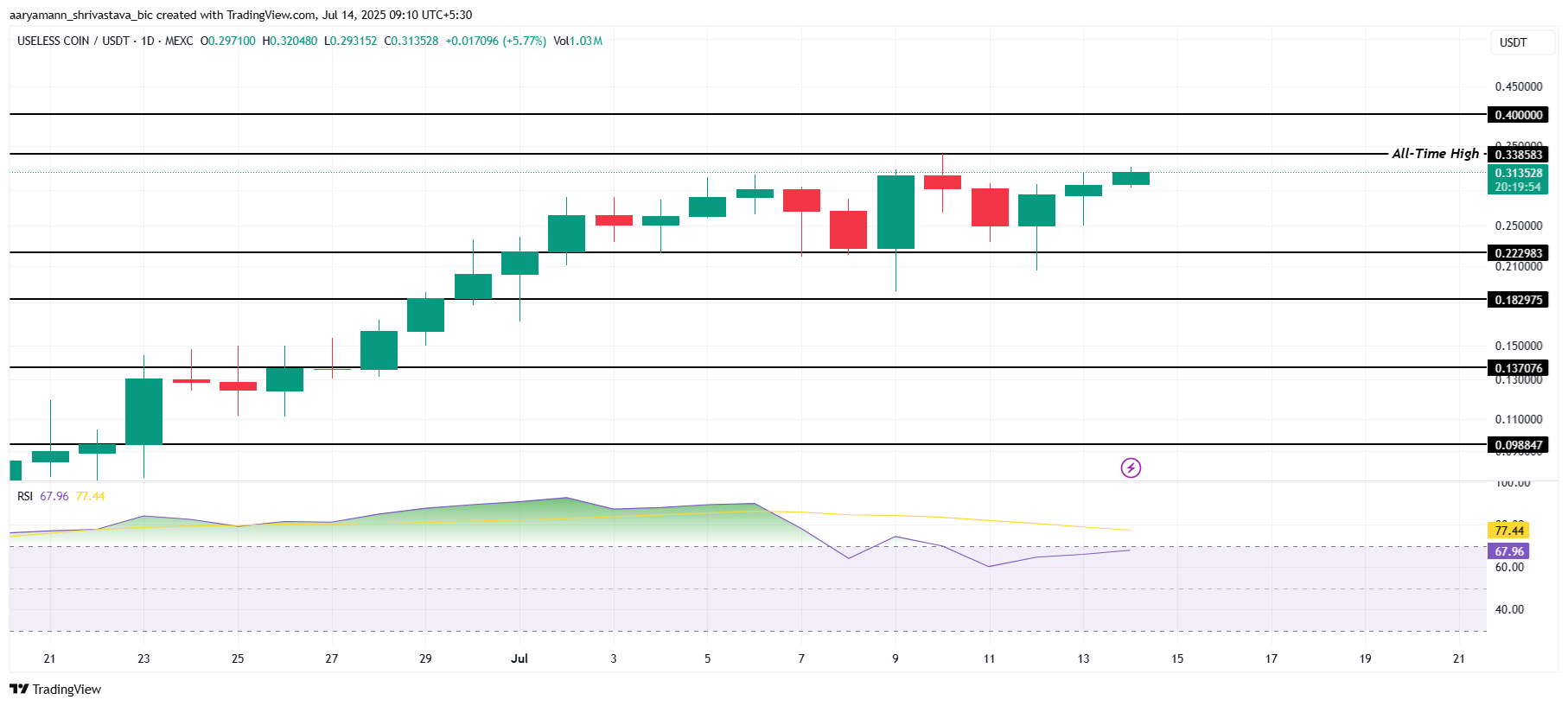 Альткоин жақында артық сатып алу жағдайларына жеткеннен кейін салқындады. Салыстырмалы күш индексі (RSI) әлі де бұқа аймағында, бұл нарықтағы оң көңіл-күйді көрсетеді. USELESS осы импульсті сақтаса, 0,338 доллардан асып, алдағы күндері 0,400 долларға жақын жаңа ATH қалыптастыра алады.