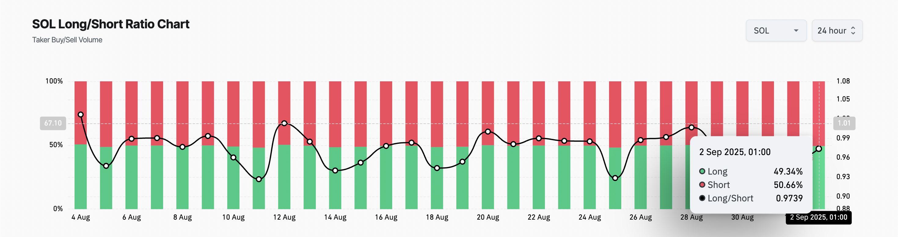 Сонымен қатар, SOL деривативтер нарығында да үрдіс басқаша емес. Coinglass мәліметтері бойынша, монетаның ұзақ/қысқа қатынасы осы жазба бойынша 0,97, бұл активтің одан әрі төмендеуі мүмкін деген нарықтық сенімділіктің артып келе жатқанын көрсетеді.