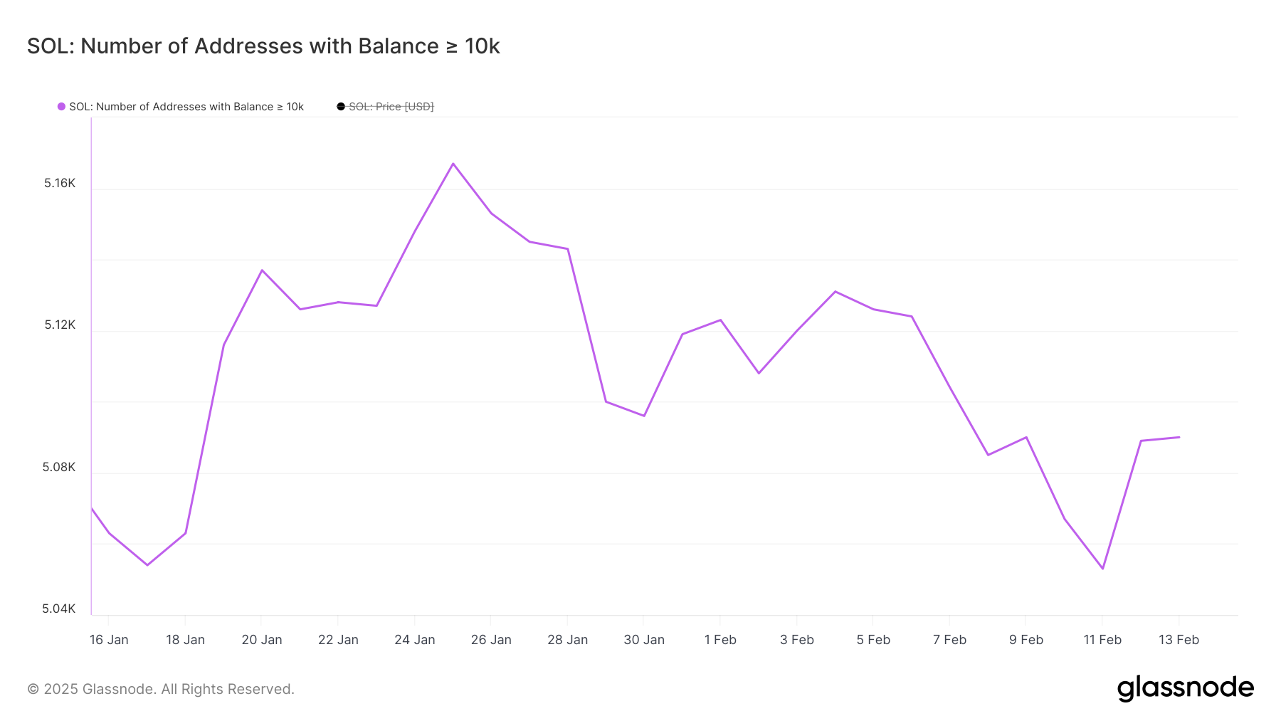 SOL киттерінің саны – кемінде 10,000 SOL ұстайтын әмияндар – соңғы күндері айтарлықтай төмендеді, 4 ақпанда 5,131-ден 11 ақпанда 5,053-ке дейін азайды.