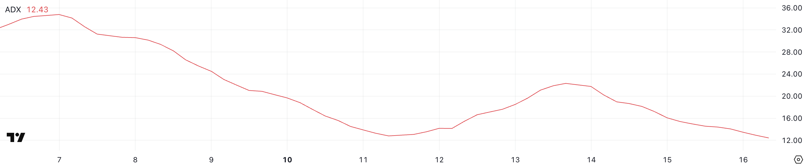 Solana үшін Орташа бағыттық индекс (ADX) қазіргі уақытта 12,4 деңгейінде, үш күн бұрын 22,3 деңгейінен төмендеді. ADX трендтің күшін өлшейді, 25-тен жоғары мәндер күшті трендті, ал 20-дан төмен мәндер әлсіз немесе трендтің жоқтығын білдіреді.