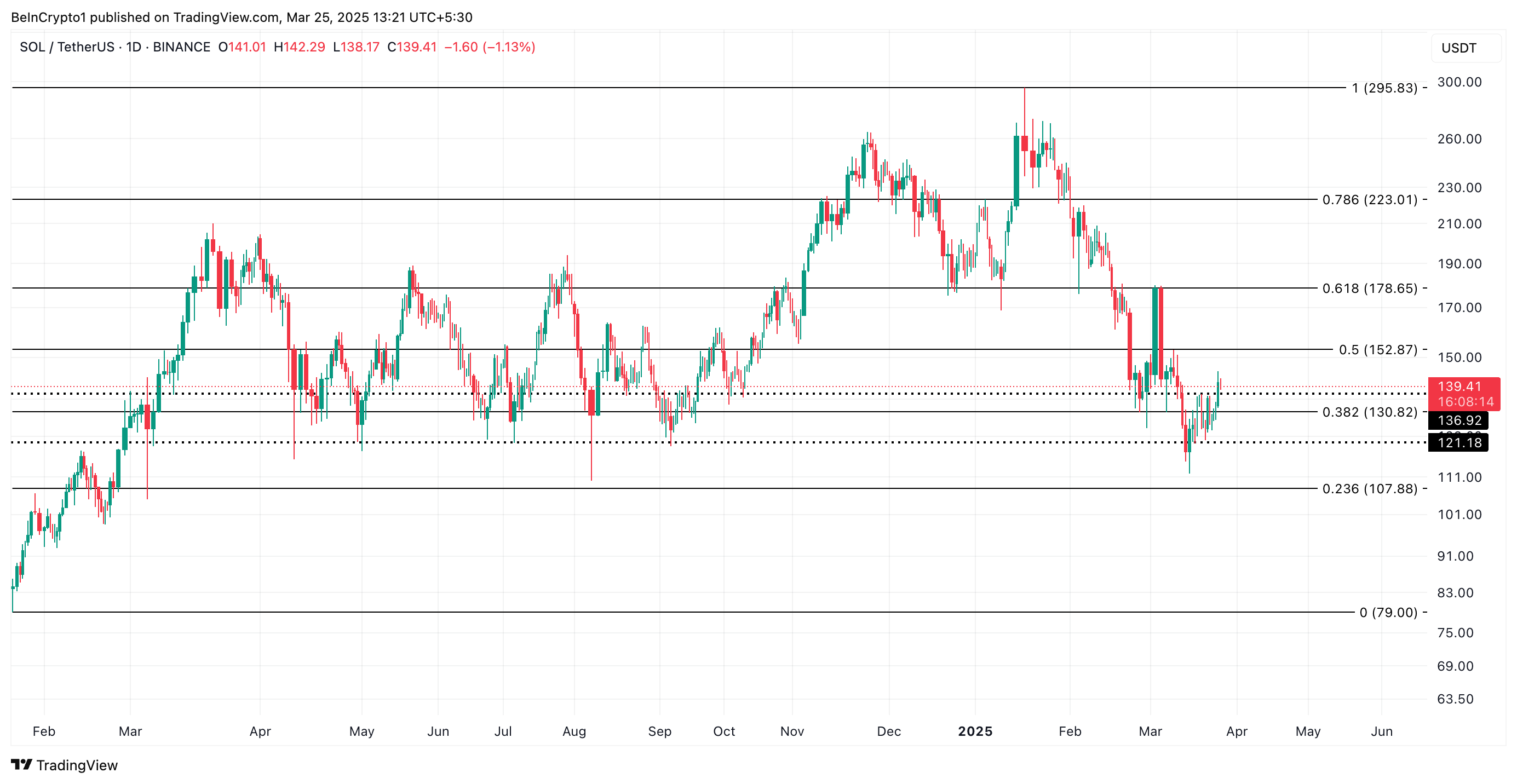 Жазу кезінде SOL 139,41 доллардан саудаланып, 136,92 долларда қалыптасқан қолдаудың үстінде тұр. Сатып алу қысымы әлсіреп, SOL сатушылары өздерінің басымдылығын нығайтқан кезде, монетаның бағасы осы қолдау деңгейін сынауға тырысуы мүмкін.