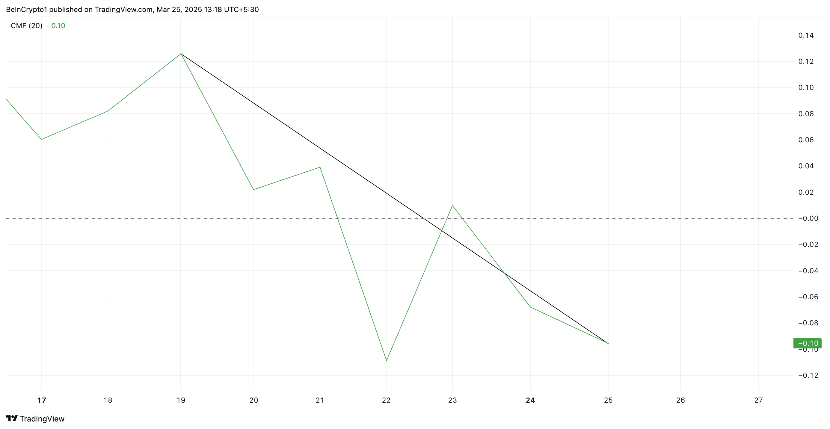 CMF индикаторы белгілі бір кезеңдегі көлем мен баға қозғалыстарын талдау арқылы сатып алу және сату қысымының күшін өлшейді. Ол -1 мен +1 аралығында өзгереді, оң мәндер күшті сатып алу қысымын, ал теріс мәндер сату басымдылығын көрсетеді.