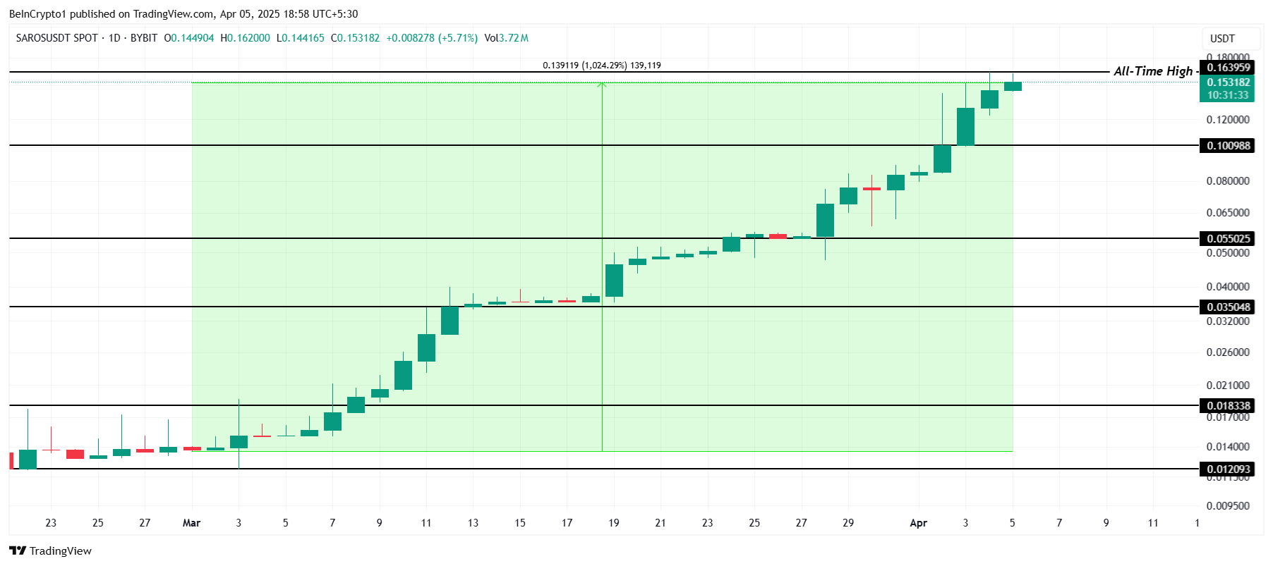 Наурыз айының басынан бастап Saros таңғаларлық 1 024%-ға өсті, қазіргі уақытта 0,153 доллар деңгейінде саудалануда. Наурыз айы бойы альткоин күн сайын дерлік жаңа ATH қалыптастырып, инвесторлардың көңіл-күйі мен сұранысының күшті екенін көрсетті.