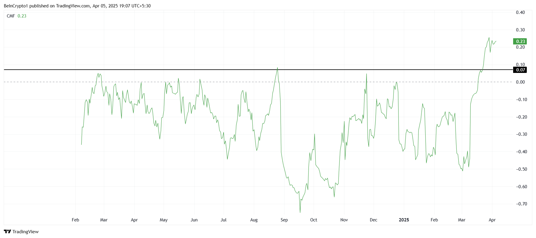 Saros-тың жалпы макро импульсі инвесторлардың қызығушылығының күшті екенін көрсетеді. Chaikin Money Flow (CMF) индикаторы өткен айда тұрақты түрде өсіп, тұрақты кірістерді білдіреді.