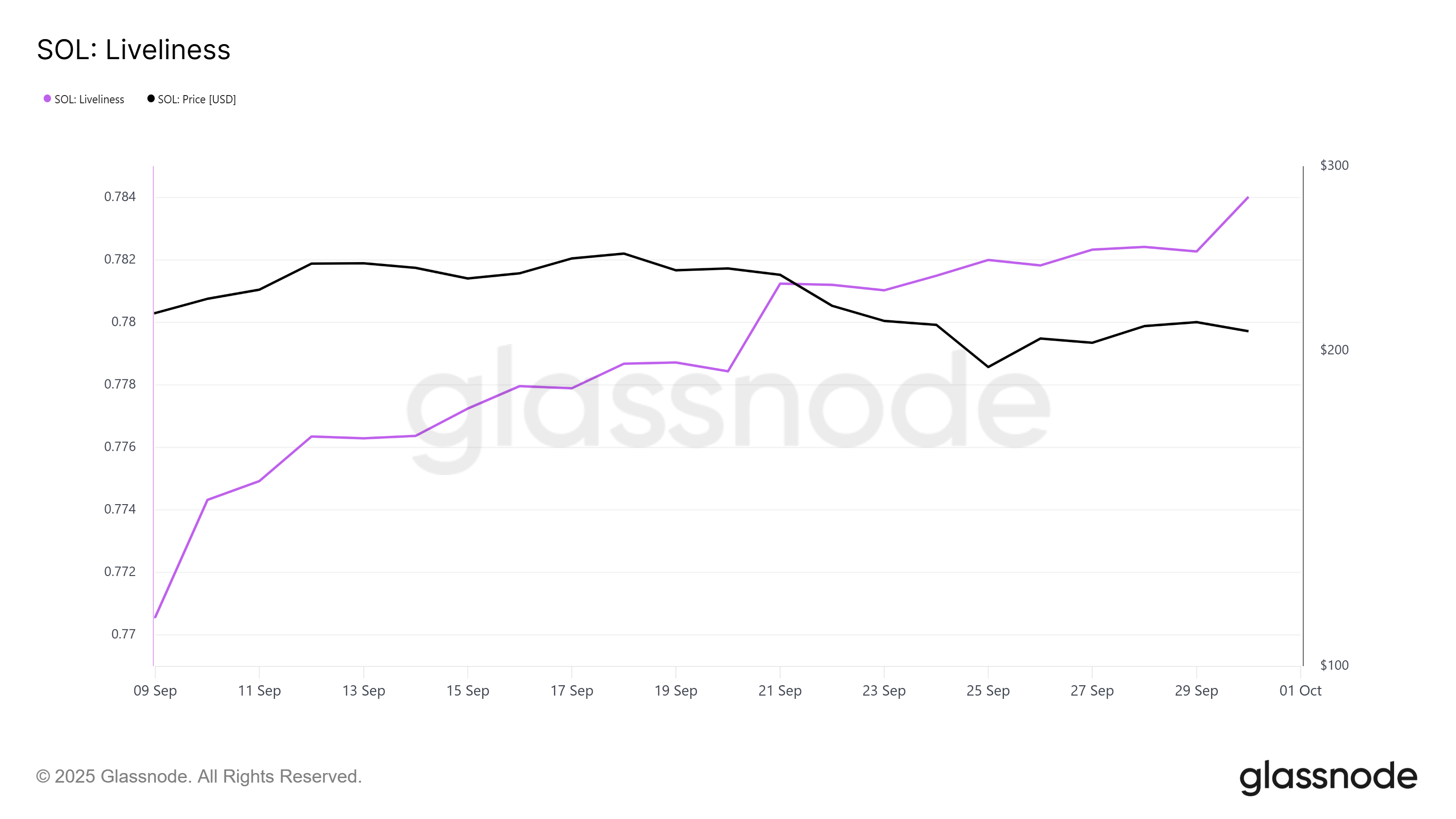 Он-чейн деректері ұзақ мерзімді иелер (LTHs) арасында аюлы көңіл-күйдің өсуін көрсетеді. Соңғы апталарда Solana-ның Liveliness метрикасы күрт өсті, бұл ұйқыдағы әмияндардан монеталардың шығуының артуын білдіреді. Бұл әрекет LTHs активтерді сатуда, сенімділікті азайтып, альткоинның жалпы баға әрекетіне төмендеу қысымын көрсетуде екенін білдіреді.