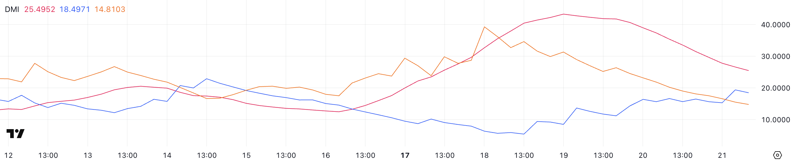 ADX-тің бұл төмендеуі төмендеу трендінің күші әлсіреп жатқанын көрсетеді, дегенмен трендтің өзі әлі де бар. ADX 25-тен жоғары болса, әдетте күшті трендті білдіреді, бірақ төмендеген мән аю импульсінің күшін жоғалтып жатқанын көрсетеді. Бұл әлеуетті консолидация кезеңіне әкелуі мүмкін.