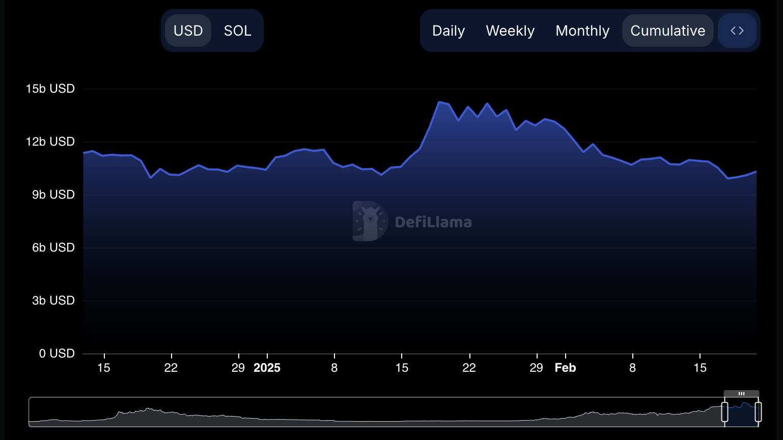 Solana-ның жалпы құлыпталған құны (TVL) қазіргі уақытта 10,3 млрд долларды құрайды, 17 ақпандағы 9,90 млрд доллардан қалпына келді, бұл 2024 жылдың 14 қарашасынан бергі ең төменгі деңгей. Осы қалпына келуге қарамастан, TVL 18 қаңтардағы 14,2 млрд доллардан шамамен 30%-ға төмендеп, инвесторлардың сенімінің азайғанын көрсетеді.