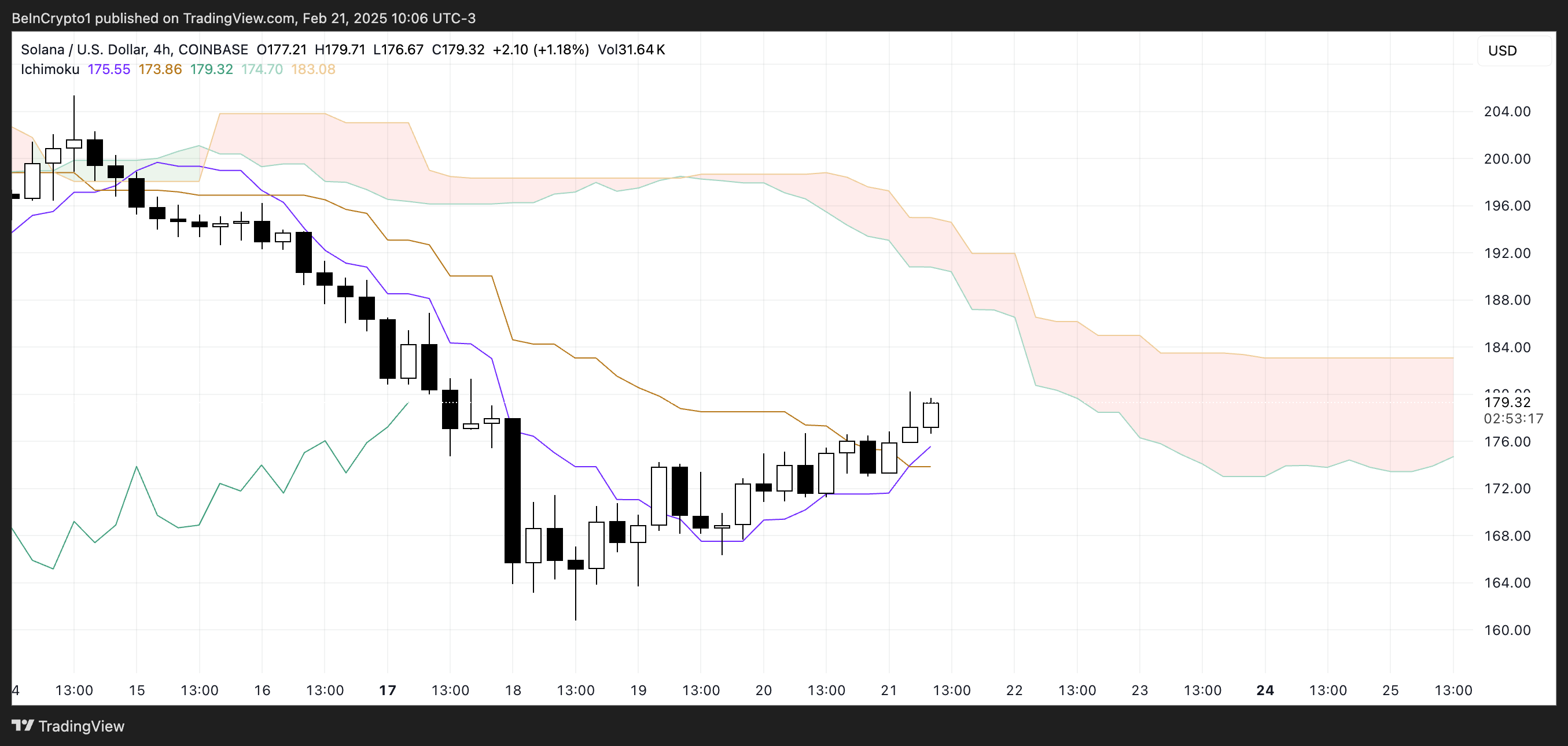 Solana-ның Ichimoku Cloud графигі бағаның қазіргі уақытта қызыл бұлттың астында екенін көрсетеді, бұл аю трендінің әлі де басым екенін білдіреді. Алайда, баға қазір көк Tenkan-sen (конверсия сызығы) және қызғылт сары Kijun-sen (негізгі сызық) үстінде саудалануда, бұл аю импульсінің әлсіреп жатқанын көрсетеді.