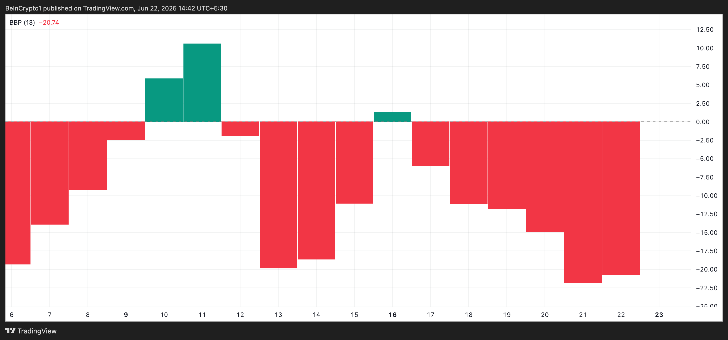 Бұл индикатор активтің бағасы мен жылжымалы орташа арасындағы айырмашылықты талдау арқылы нарықтағы бұқалар мен аюлардың күшін өлшейді. Ол теріс болғанда, аюлар басым, өйткені бағалар үнемі орташа деңгейден төмен түсіп, сату қысымы сатып алу қызығушылығынан асып түсетінін көрсетеді.