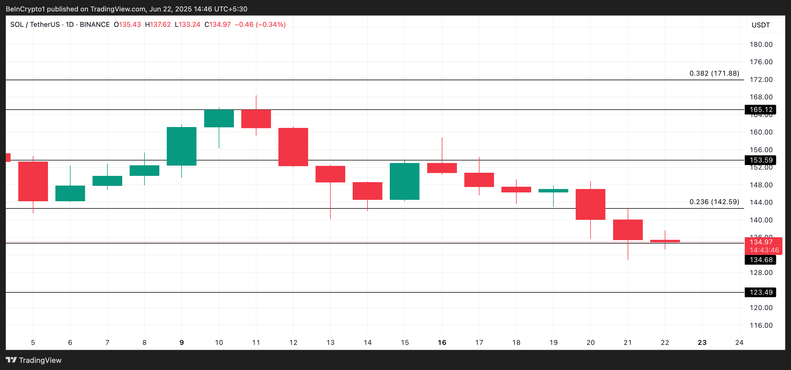 Бұл аю басымдығы SOL бағасының одан әрі төмендеуі мүмкін деген сенімділіктің артуын көрсетеді, әсіресе 134 доллар қолдау деңгейі ретінде сақталмаса.