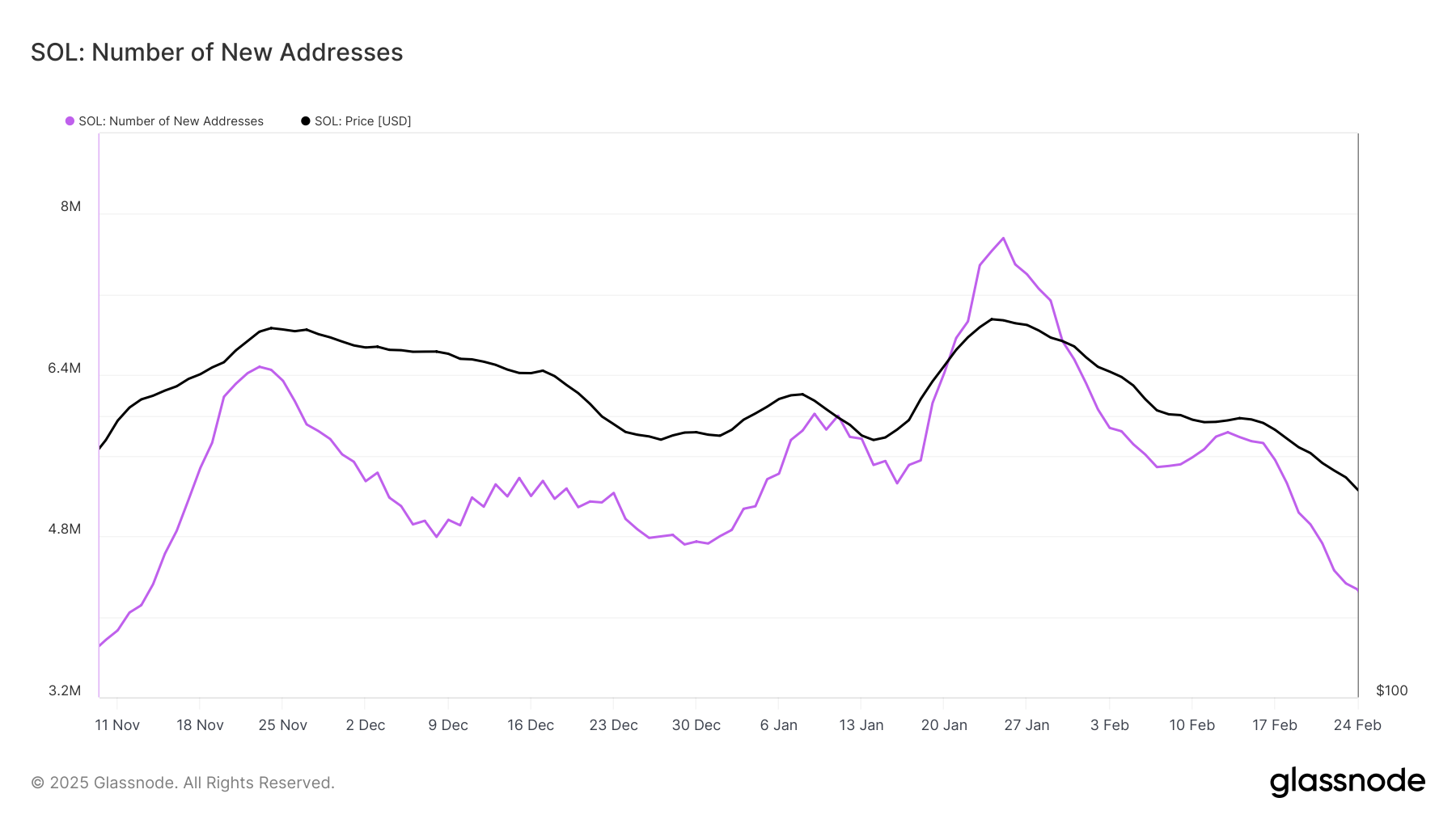 Солананың кеңірек макро импульсі де әлсіреу белгілерін көрсетуде. Желідегі жаңа мекенжайлар үш айлық ең төменгі деңгейге дейін төмендеді, бұл SOL-ға жаңа инвестициялардың жоқтығын білдіреді. Потенциалды сатып алушылардың қызығушылығының төмендеуі Солананың нарықта тартымдылығын жоғалтып жатқанын көрсетеді, өйткені жаңа инвесторлар бағаның тұрақсыздығы кезінде криптовалютаға міндеттеме алуға құлықсыз.