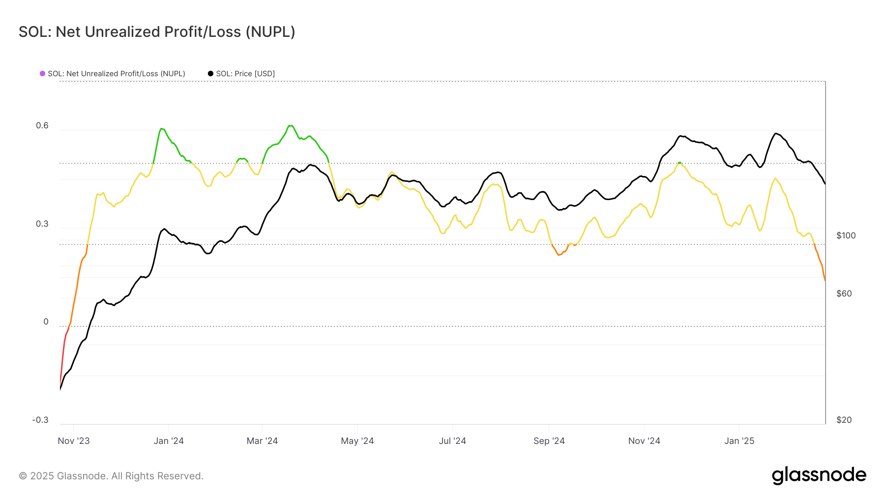 Қазіргі Солана нарығындағы көңіл-күй басым түрде аюлы, бұл NUPL (Таза жүзеге асырылмаған пайда мен шығын) метрикасының өсуімен көрсетіледі. Бұл инвесторлар арасындағы жүзеге асырылмаған шығындардың айтарлықтай өсуін көрсетеді, бұл кең таралған қорқынышқа ықпал етеді. Инвесторлар бағаның одан әрі төмендеуінен қорқып, көптеген адамдар Солана экожүйесіне қатысудан бас тартып жатыр.