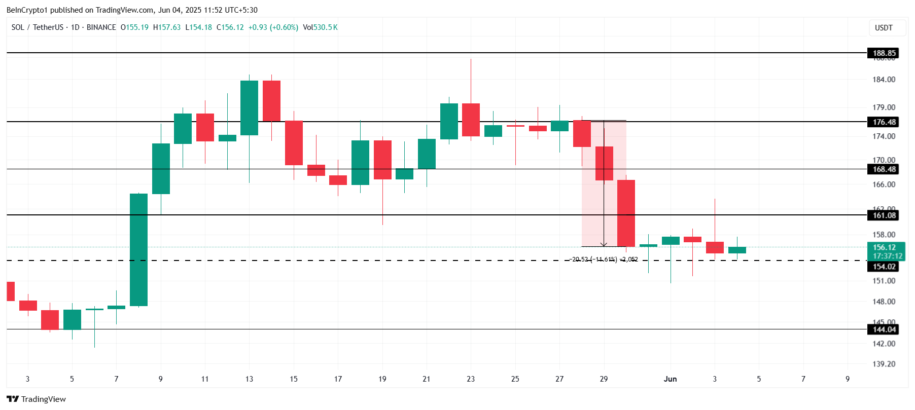 Алайда, соңғы сатылымдардан туындаған қысым Солананы 154 доллар қолдауынан төмен түсіріп, 144 долларға дейін төмендеуге әкелуі ықтимал. Егер бұл орын алса, аюлы тренд ұзарып, инвесторлар үшін одан әрі шығындарға әкелуі мүмкін. Сату қысымының артуы бағаны одан әрі төмендетіп, теріс импульсті күшейтуі ықтимал.