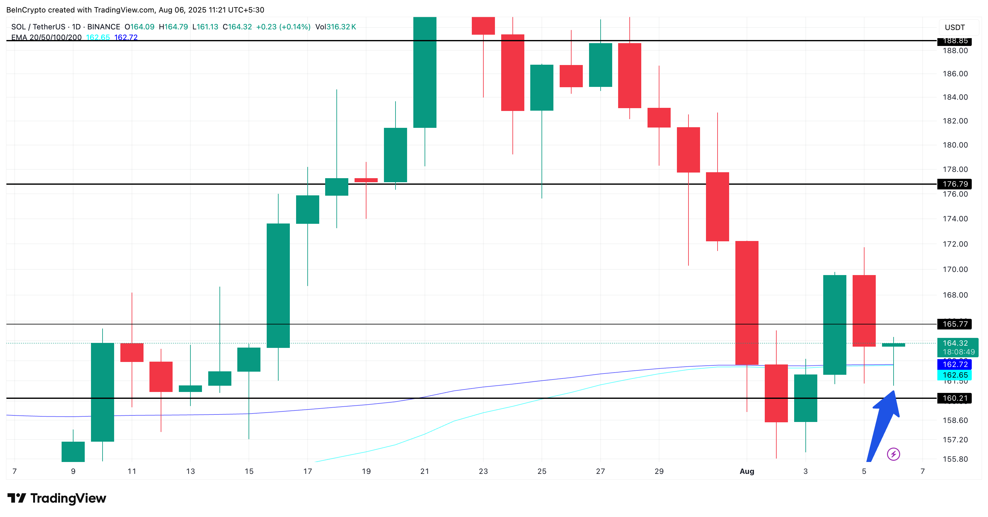 Қазіргі уақытта SOL 160 доллар қолдау деңгейінен жоғары тұр. Егер бұл деңгей сақталса және Solana 176 долларды (қазіргі деңгейден 10% итеру) қайтарып алса, қысқа мерзімді тренд бұқаға айналуы мүмкін.