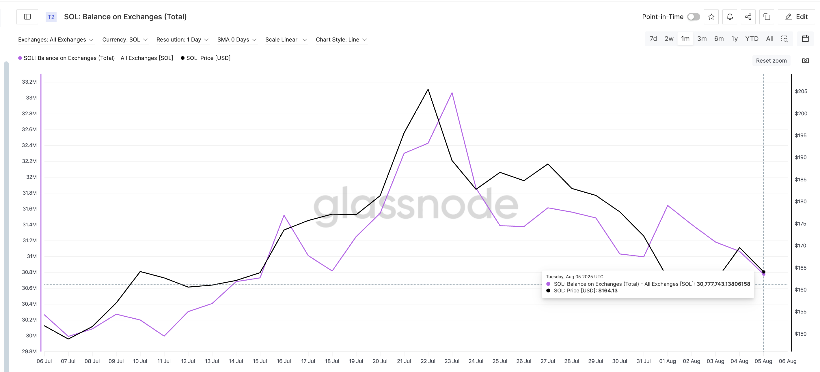 Алғашқы негізгі өзгеріс Solana-ның биржалардағы балансына байланысты, ол 23 шілдеде 33,06 млн-нан 5 тамызда 30,78 млн SOL-ға дейін күрт төмендеді; шамамен 10%-ға құлдырау. Бұл орталықтандырылған биржаларда аз токендер отырғанын білдіреді, бұл сатылым қысымының азаюының классикалық белгісі.