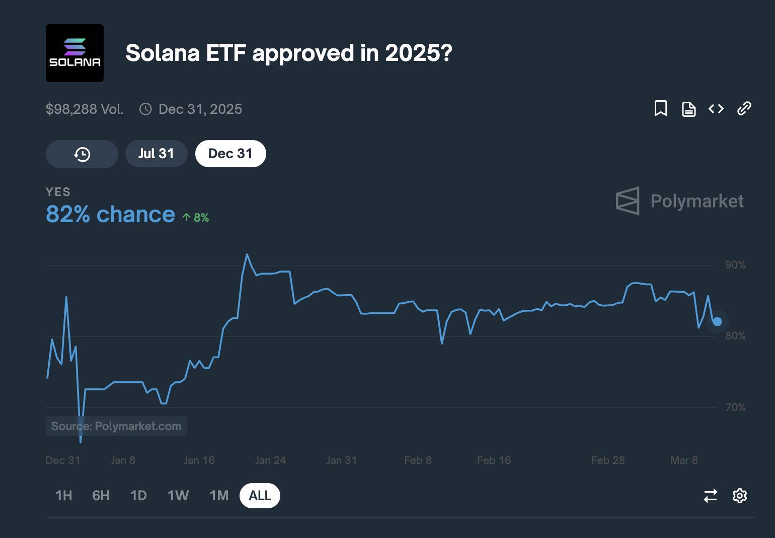 Сонымен қатар, Polymarket болжам нарығы 2025 жылы Solana ETF-інің мақұлдану мүмкіндігін 82% деп бағалайды.