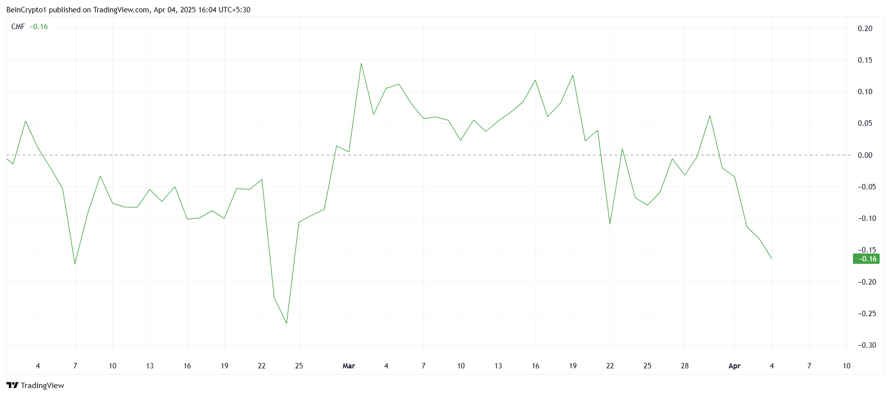 Чайкин ақша ағыны (CMF) индикаторы да Solana үшін алаңдатарлық трендті көрсетеді. Қазіргі уақытта айлық минимумда тұрған CMF шығыстардың кірістерден асып жатқанын көрсетеді, бұл инвесторлардың Solana-дан ақшаларын шығарып жатқанын білдіреді. Бұл сатып алу қысымының болмауы альткоиннің қалпына келу перспективаларына зиян келтіруде, өйткені шығыстар активке деген сенімнің азайғанын білдіреді.