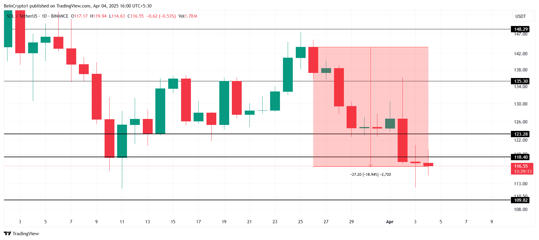 Соңғы уақытта Solana айтарлықтай баға түзетулеріне тап болды, наурыз айының ортасында қол жеткізген табыстарын жойды. Қазіргі уақытта альткоин 116 доллар деңгейінде саудалануда, бұл соңғы он күнде 19%-ға жоғалтуды көрсетеді.