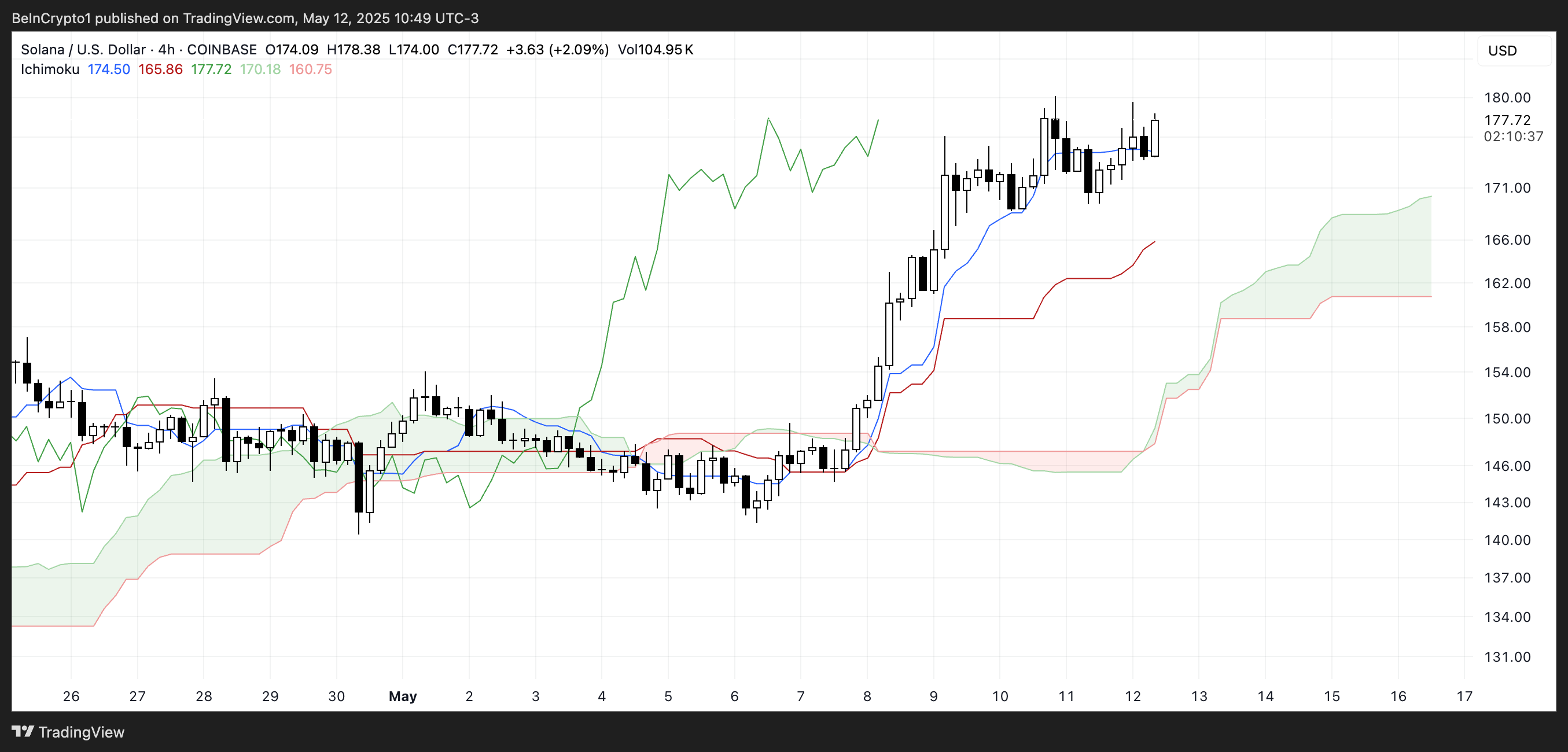 Солананың Ichimoku Cloud графигі қазіргі уақытта бұқа құрылымын көрсетуде. Баға Kumo (бұлт) сызығынан әлдеқайда жоғары саудалануда, бұл қазір жасылға айналған, яғни импульс бұқаларға қолайлы екенін білдіреді.