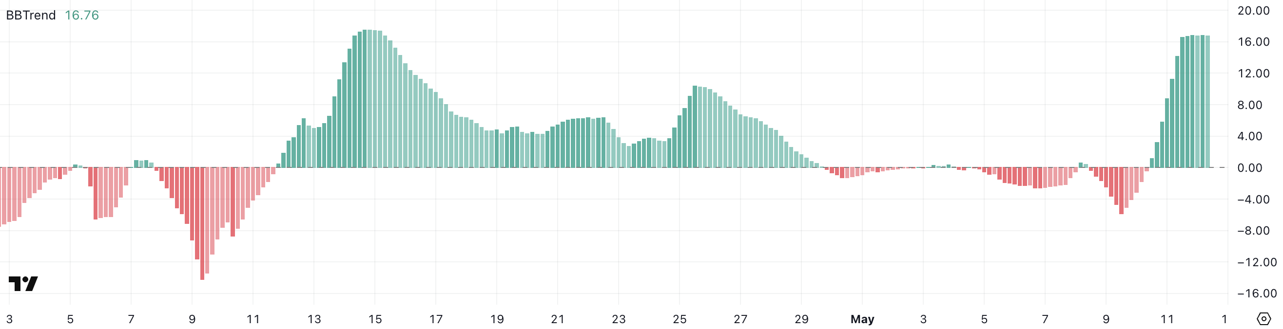 BBTrend соңғы бірнеше сағат ішінде 16,7 деңгейінде тұрақтанды, бұл күшті бұқа импульсінің қазір консолидациялануы мүмкін екенін көрсетеді.