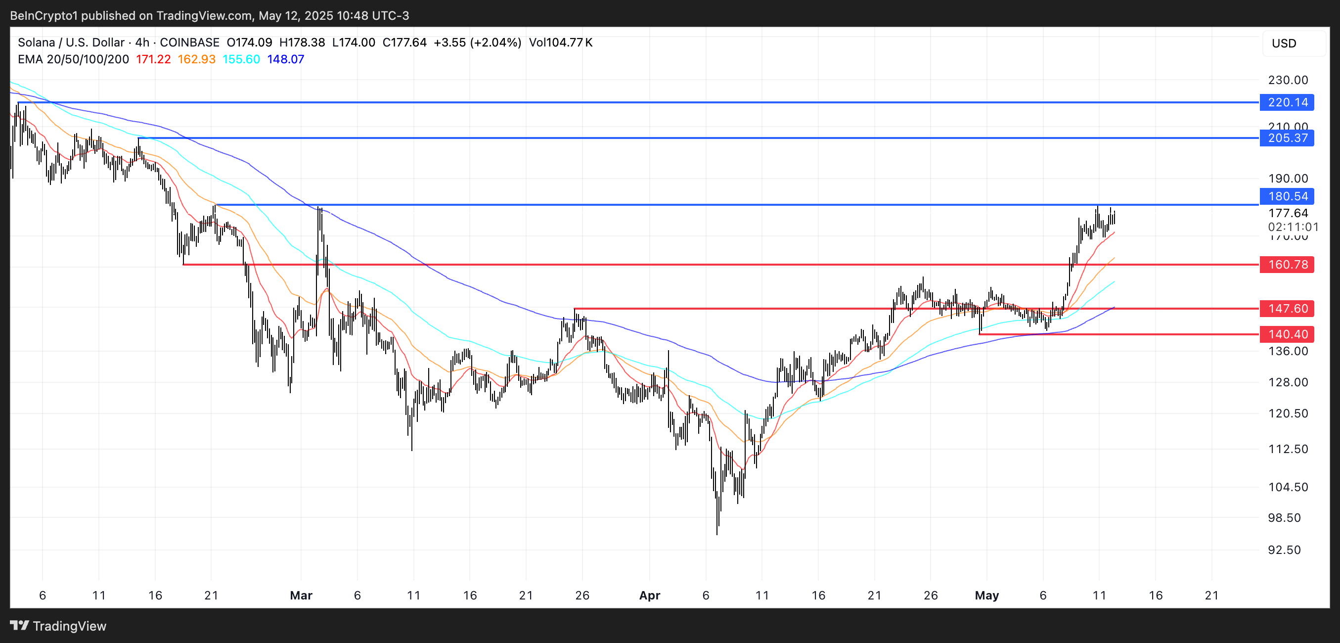 Солананың бағасы 180,54 доллардағы негізгі қарсылық деңгейінен сәл төмен саудалануда, бұл аймақ соңғы сессияларда оның жоғары қозғалысын шектеді.