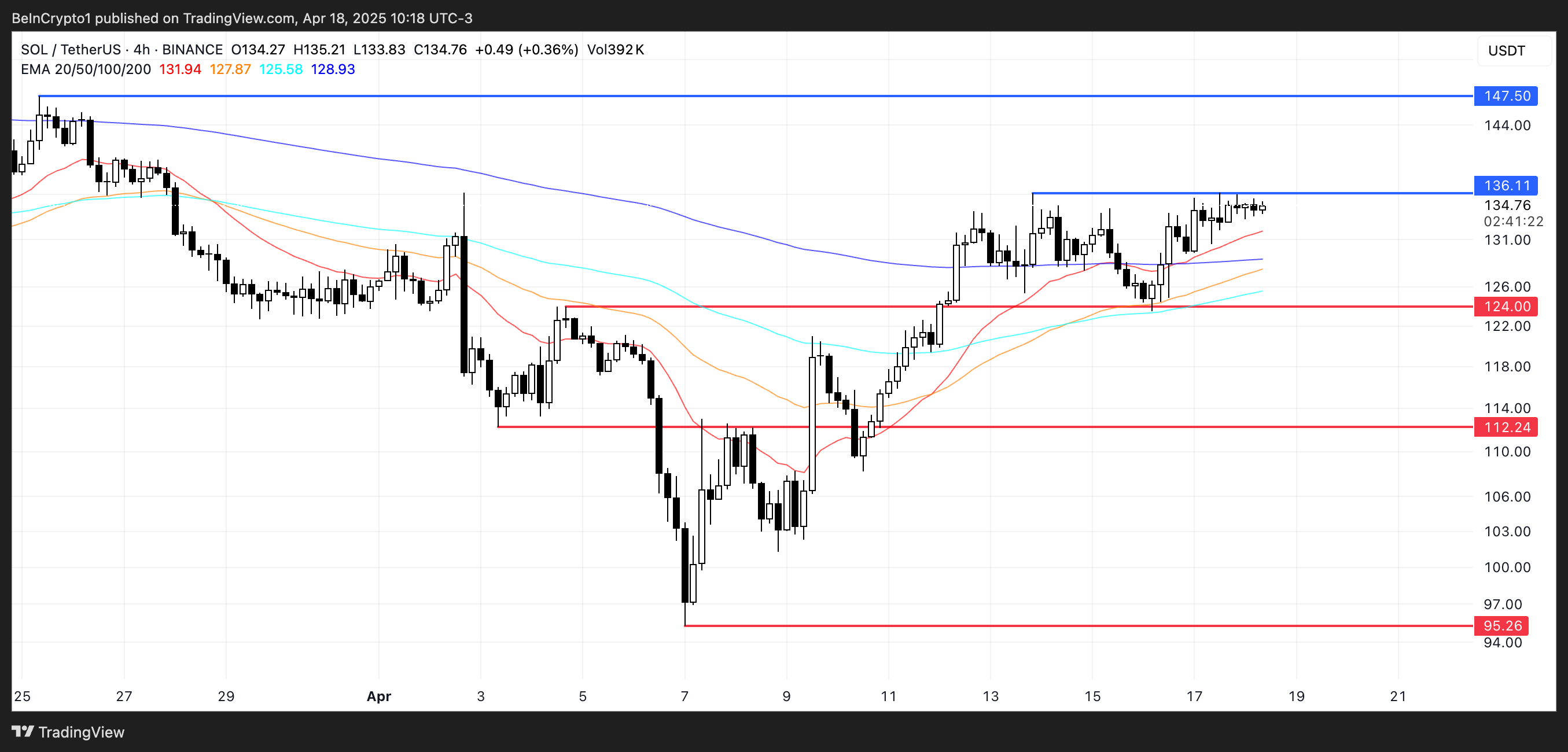 Solana-ның EMA сызықтары бұқалық құрылымды көрсетуді жалғастыруда, қысқа мерзімді орташа мән ұзақ мерзімді мәннен жоғары болып, оң импульстің сақталып тұрғанын білдіреді.