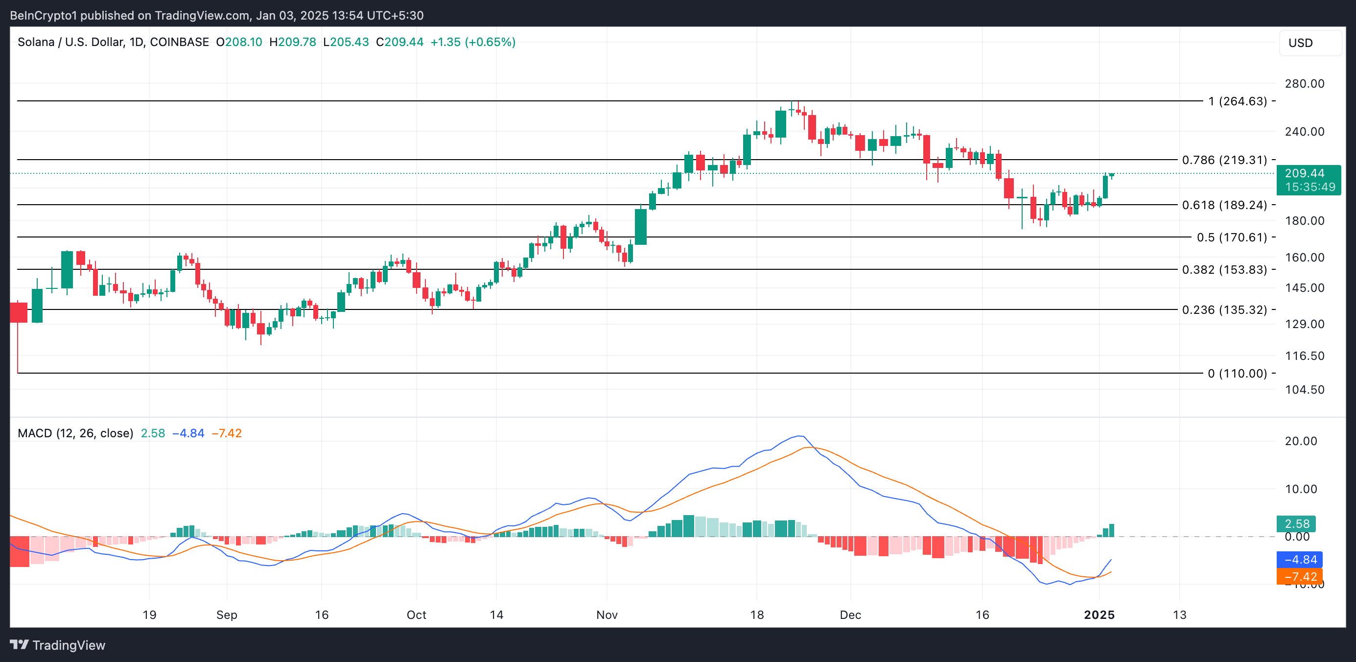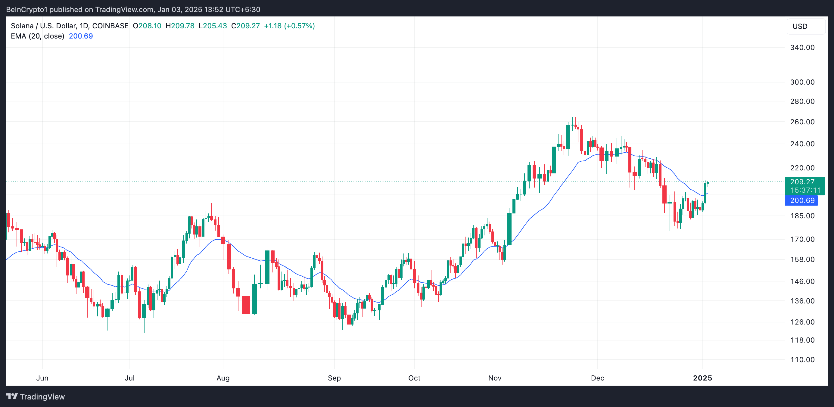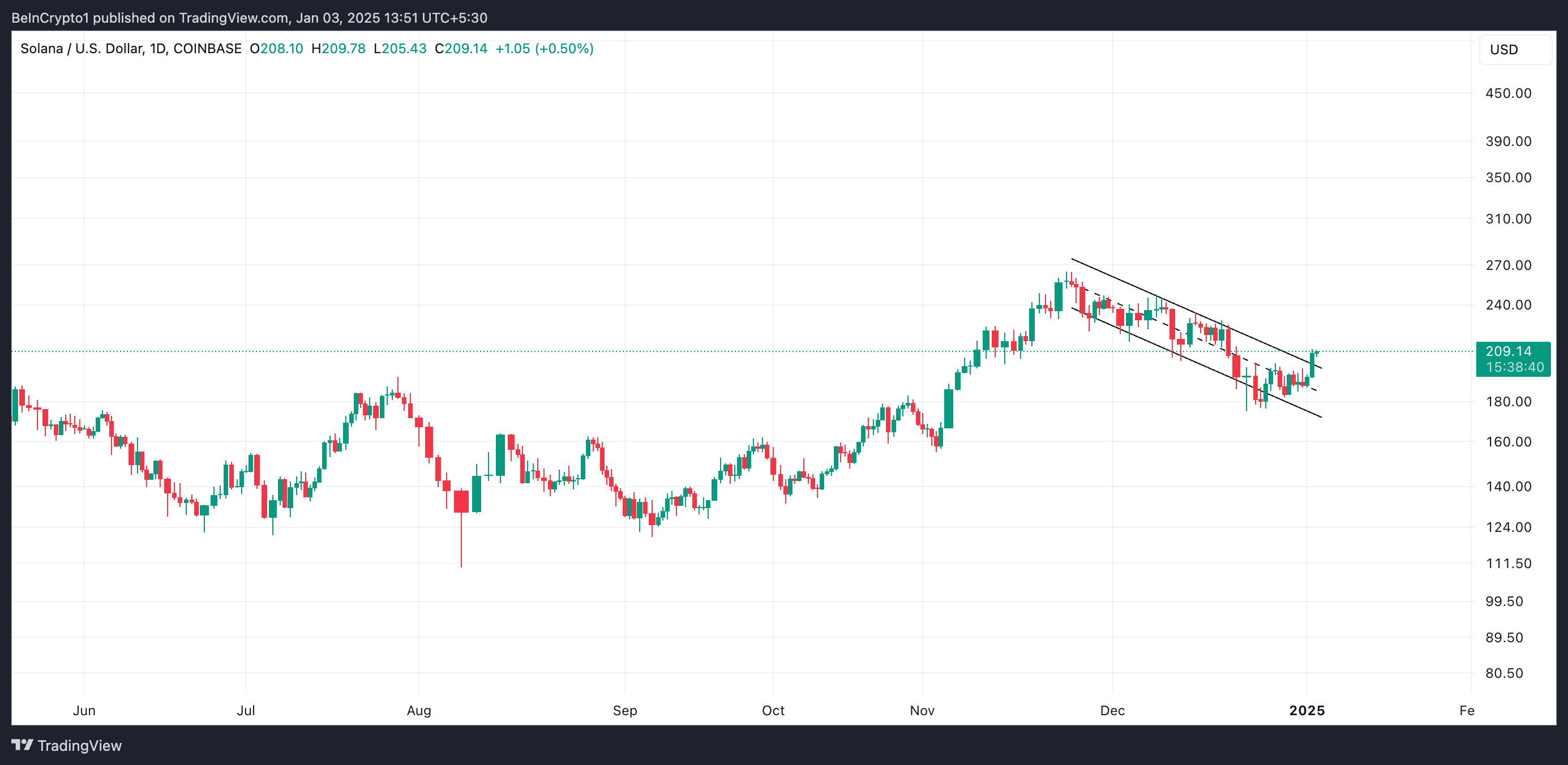 Шын мәнінде, 2 қаңтардағы сауда сессиясында SOL төмендейтін параллель арнадан жоғары көтерілді, ол 23 қарашадан бері саудаланып келеді. Бұл арна активтің бағасы төмендеу үрдісінде болған кезде қалыптасқан екі төмендейтін параллель тренд сызығынан тұрады.