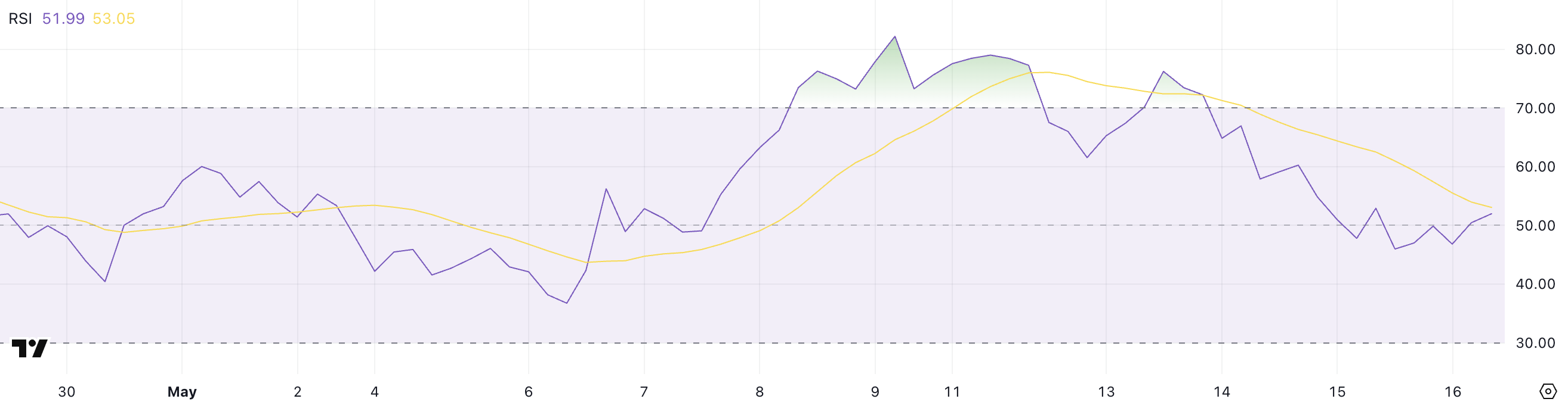 RSI 0-ден 100-ге дейінгі диапазонда болатын импульс индикаторы болып табылады, 70-тен жоғары мәндер артық сатып алынған жағдайларды, ал 30-дан төмен мәндер артық сатылған аймақты көрсетеді. 51,99 деңгейінде Солана бейтарап аймақта орналасқан, бұл әдетте консолидация немесе шешімсіздік кезеңін білдіреді.