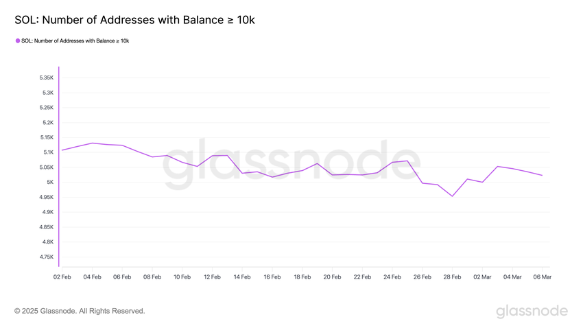 10 000 SOL-дан кем емес ұстайтын Solana киттерінің саны 28 ақпан мен 3 наурыз аралығында 4 953-тен 5 053-ке дейін өсті. Алайда, содан бері бұл сан тұрақты түрде төмендеп, қазір 5 023-ті құрайды.