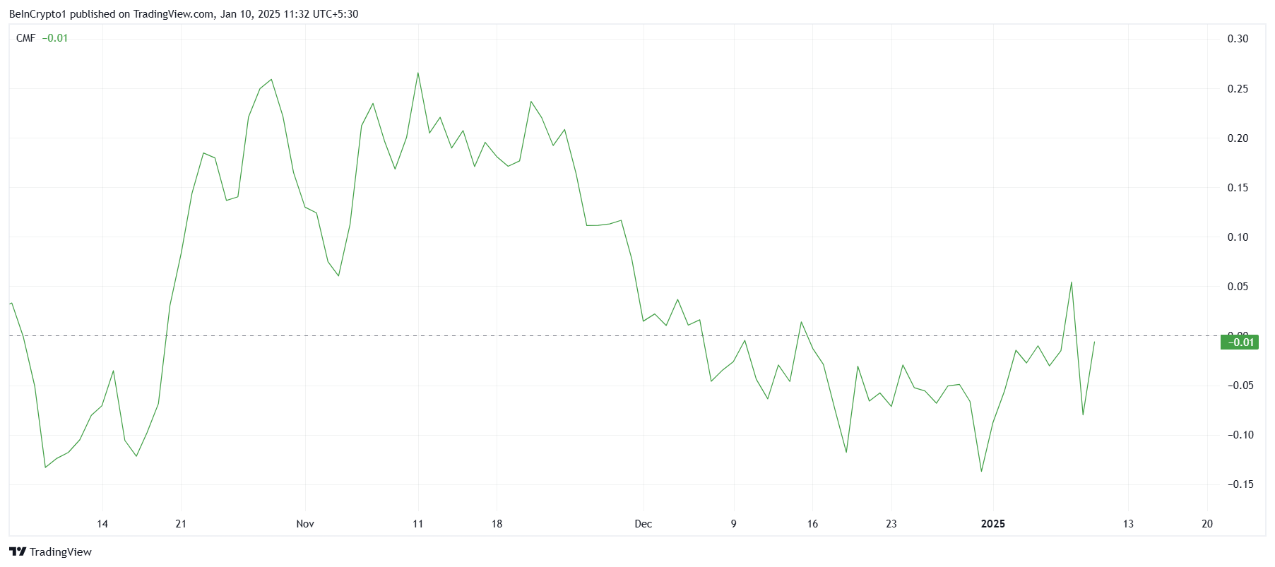 Чайкин Ақша Ағыны (CMF) индикаторы Соланаға кірістердің айтарлықтай қалпына келтіруді жүргізу үшін әлі де жеткіліксіз екенін көрсетеді. Инвесторлар оптимистік болып қалса да, материалдық кірістердің болмауы Солананың қызығушылықтың артуы мен белсенді мекенжайлардың көбеюінен пайда алу қабілетін шектеді.